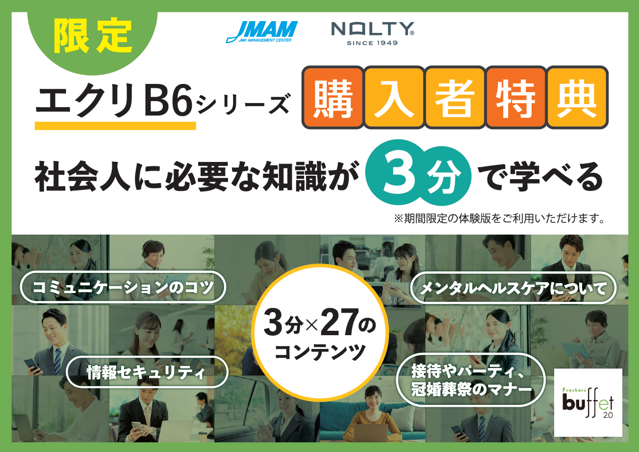 新社会人におすすめの「NOLTY エクリ B6」シリーズに、この度新社会人に役立つ特典がつきました。JMAMは「成長に、寄り添う。」をパーパスとして掲げ、手帳事業の他に人材育成支援事業も展開しています。今回の手帳購入特典では、人材育成支援事業で法人向けに提供するWeb定額制のサブスクリプション教材「フレッシャーズ・ビュッフェ」※1の一部を無料で利用できます。