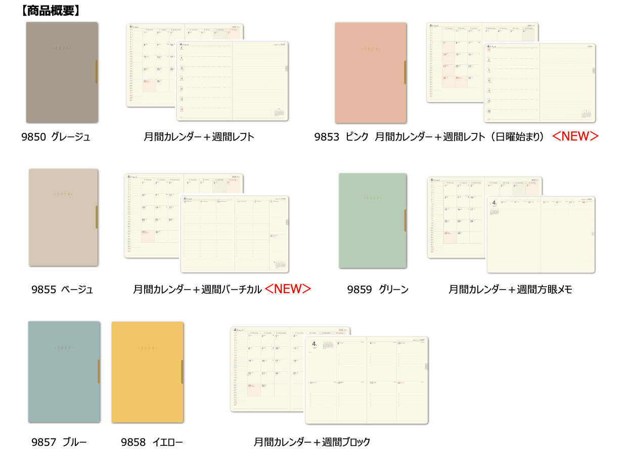 24年4月始まり版では、新たに日曜始まりの週間レフトと週間バーチカルが加わり、5種類のレイアウトからライフスタイルに合わせて選ぶことが出来ます。
