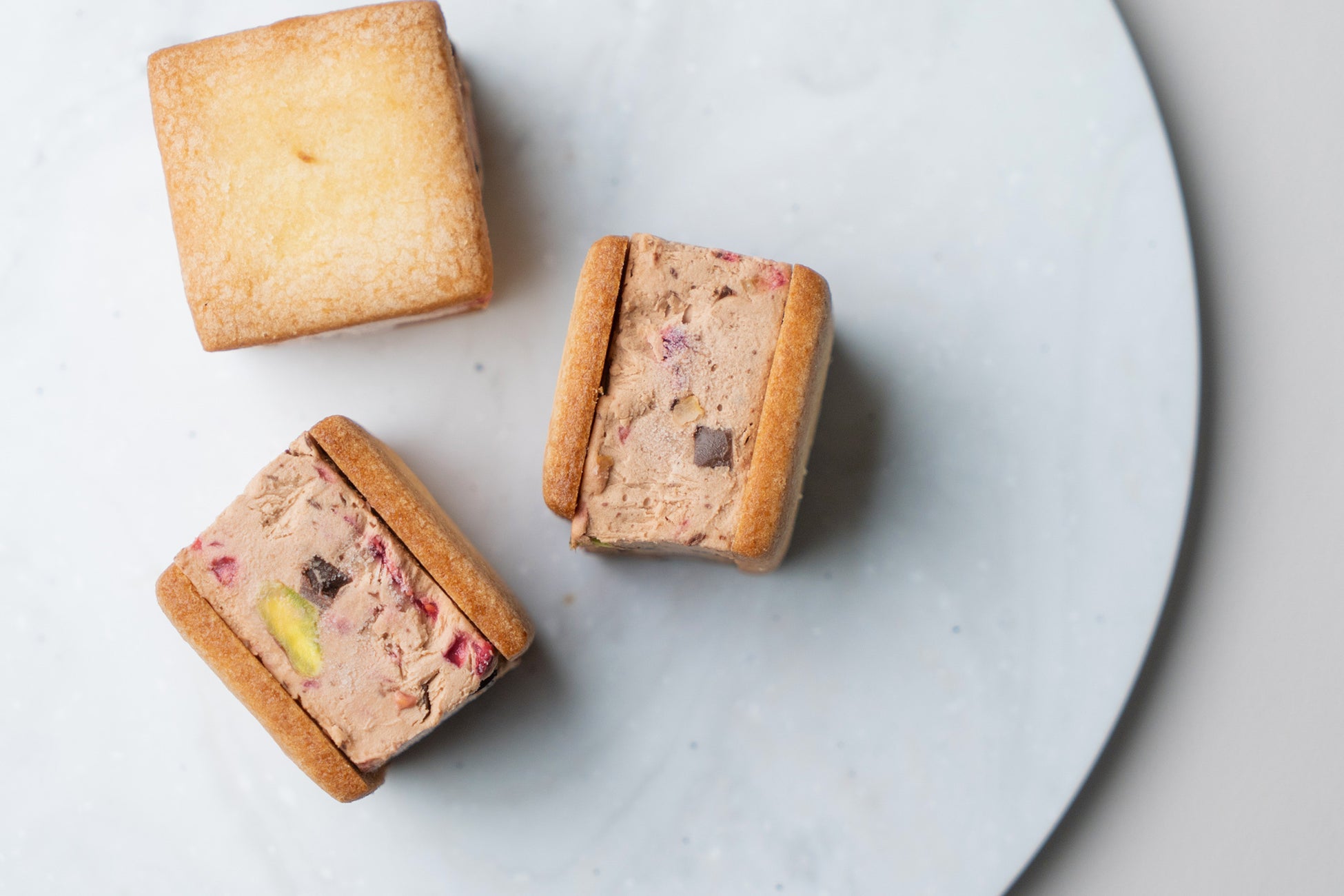 『CASSATA Sand chocolate』は、ビターなチョコレートダイスやごろっとしたピスタチオ、ラズベリーを贅沢に混ぜ込んだチョコレートカッサータを、アーモンドの香り豊かなサブレでサンドしたワンハンドサイズのひんやりスイーツです。