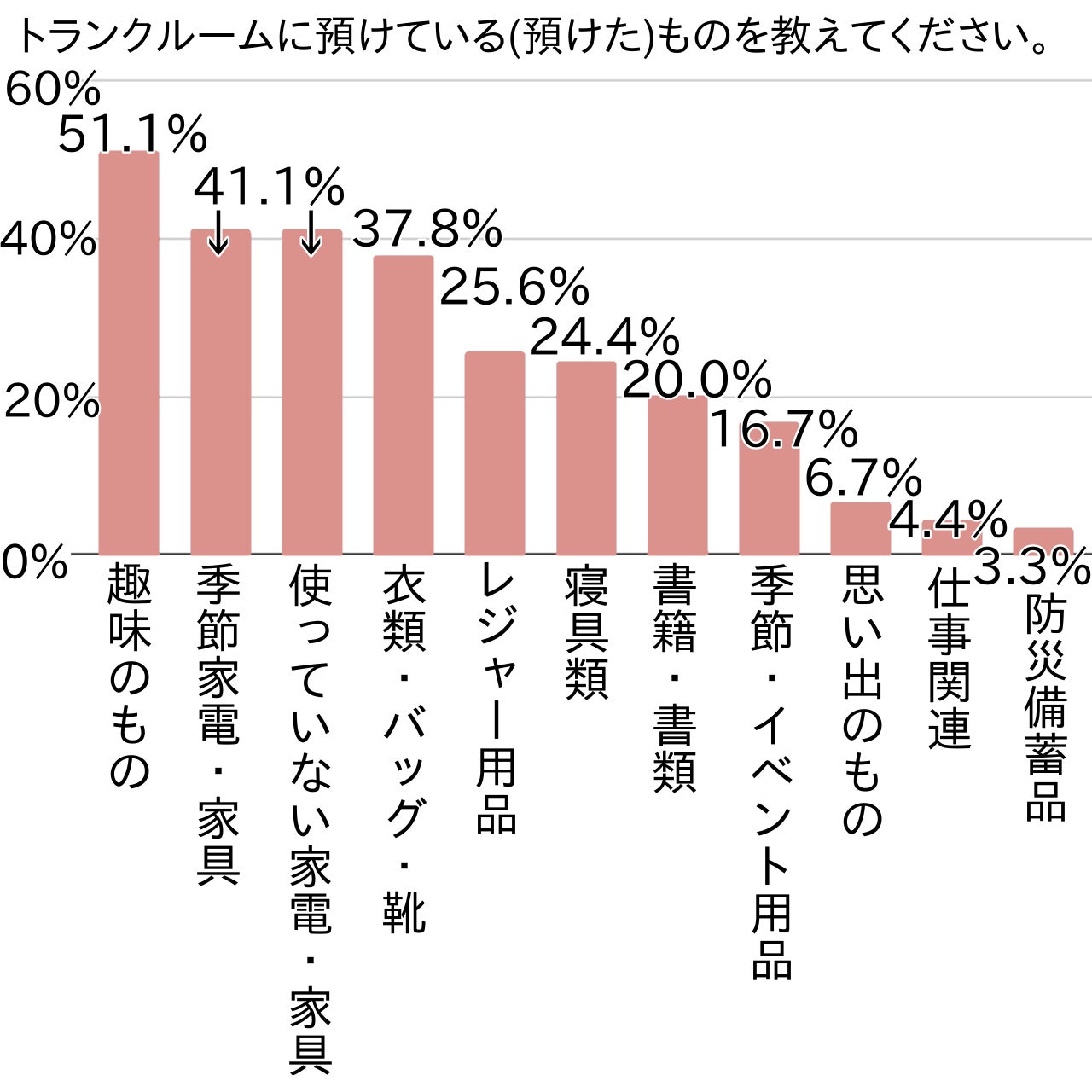 トランクルームの収納物について、「趣味のもの」(51.1%)が最多でした。