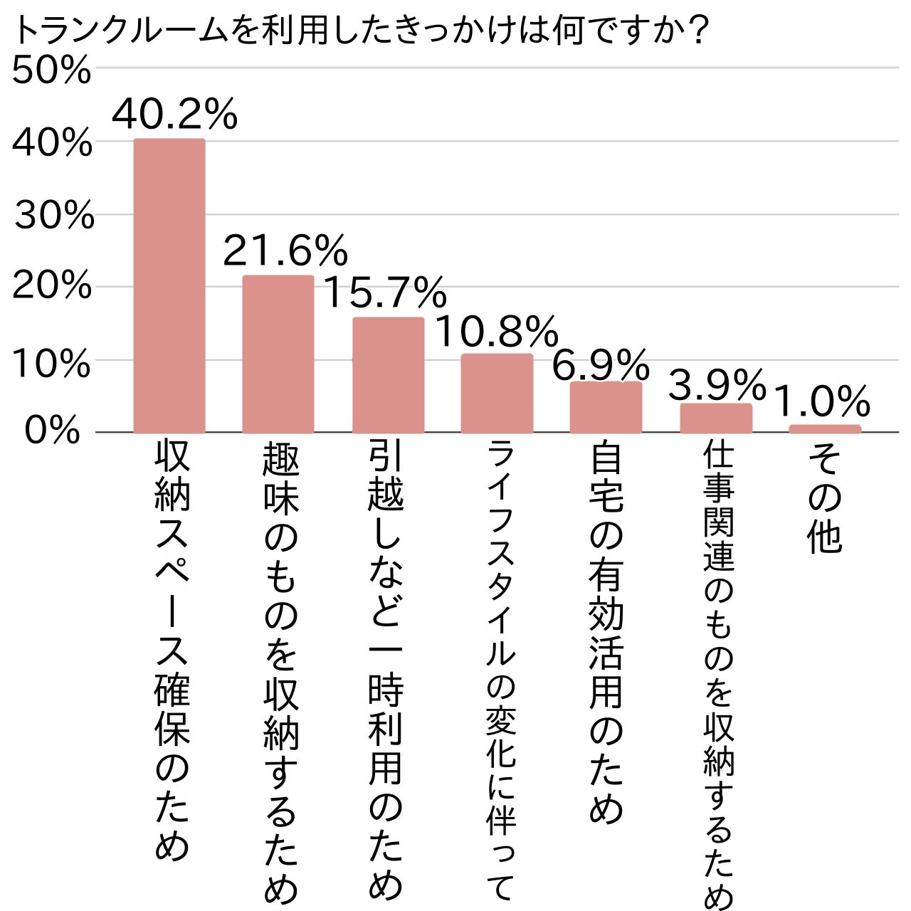 トランクルーム利用のきっかけは「収納スペース確保のため」(40.2%)が最多でした。