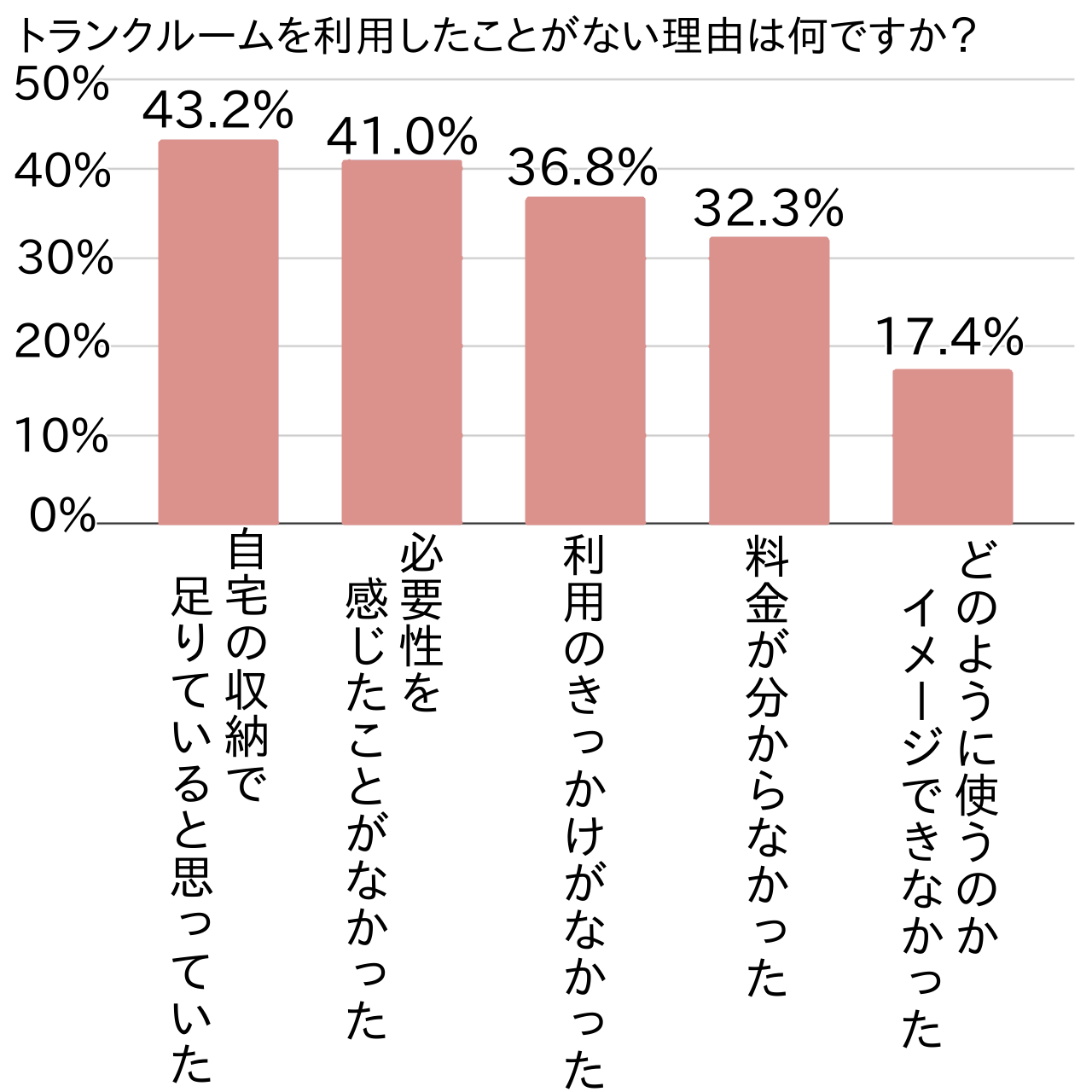 トランクルームを使っていない理由として最も多かったのは「自宅の収納で足りていると思っていた」(43.2%)で、「必要性を感じたことがなかった」(41.0%)、「利用のきっかけがなかった」(36.8%)が続きました。