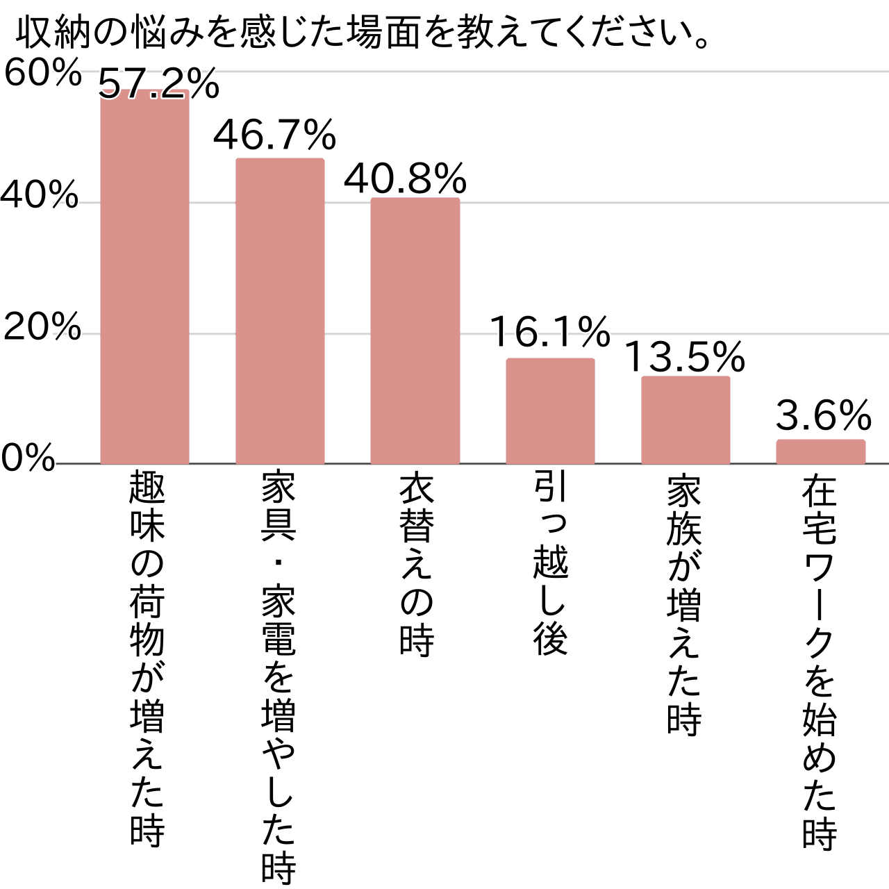 収納の悩みを感じる場面は「趣味の荷物が増えた時」(57.2%)が最多でした。