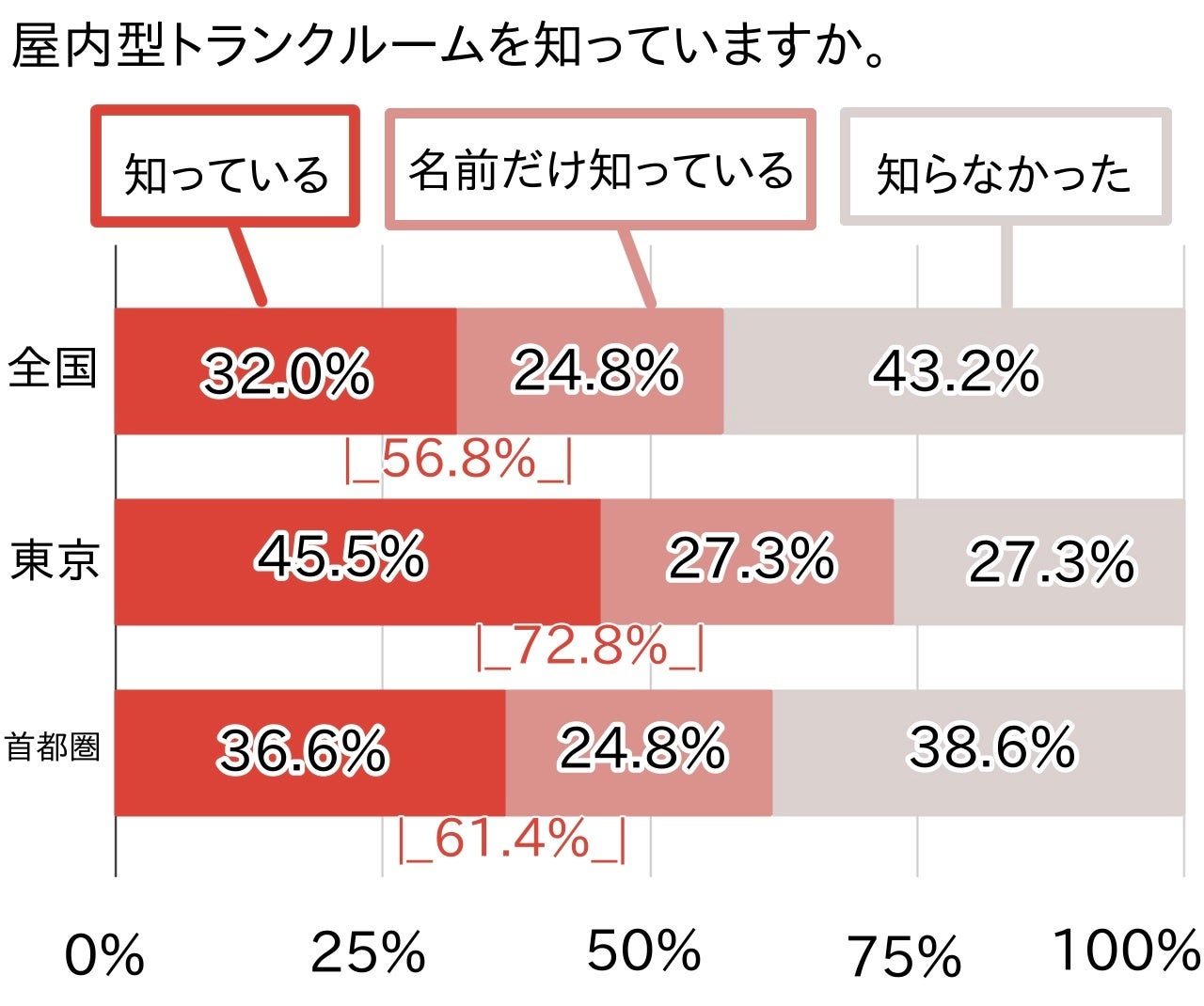 屋内型トランクルームの認知度(知っている+名前だけ知っている)は、全国で56.8%でした。