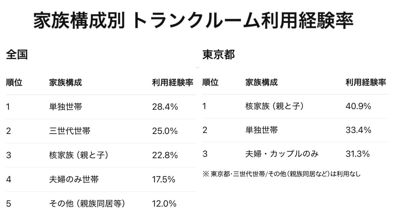 トランクルームは、全国的には単身世帯の利用、東京都ではファミリー層の利用が多い傾向にあります。