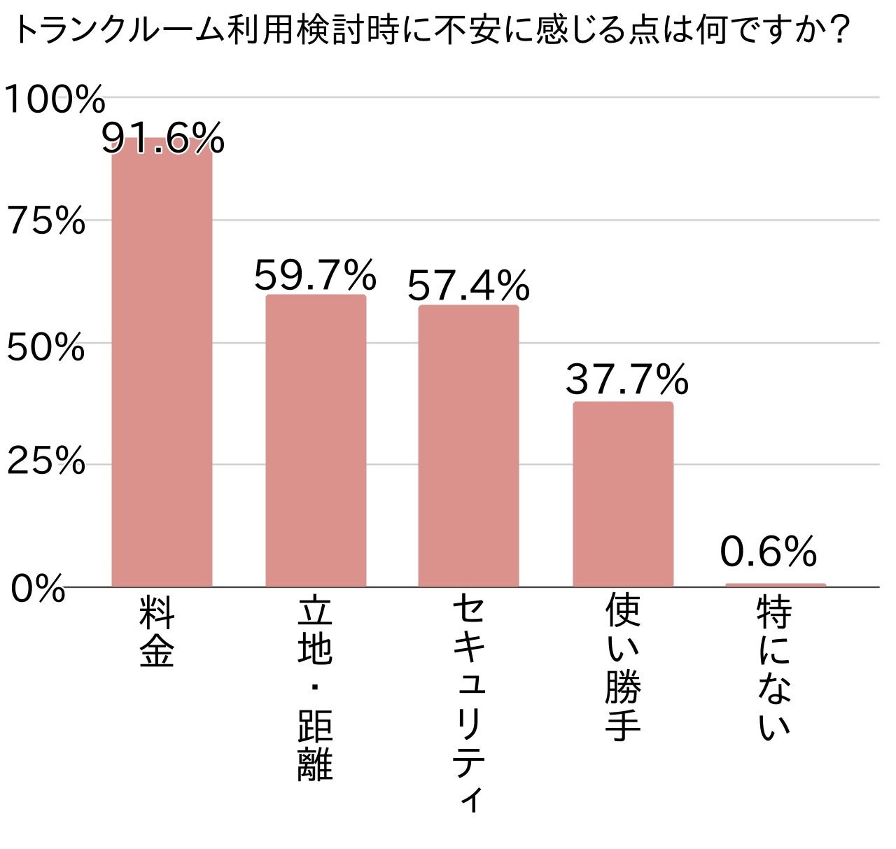 トランクルーム利用検討時不安として「料金」が91.6%で突出しました。