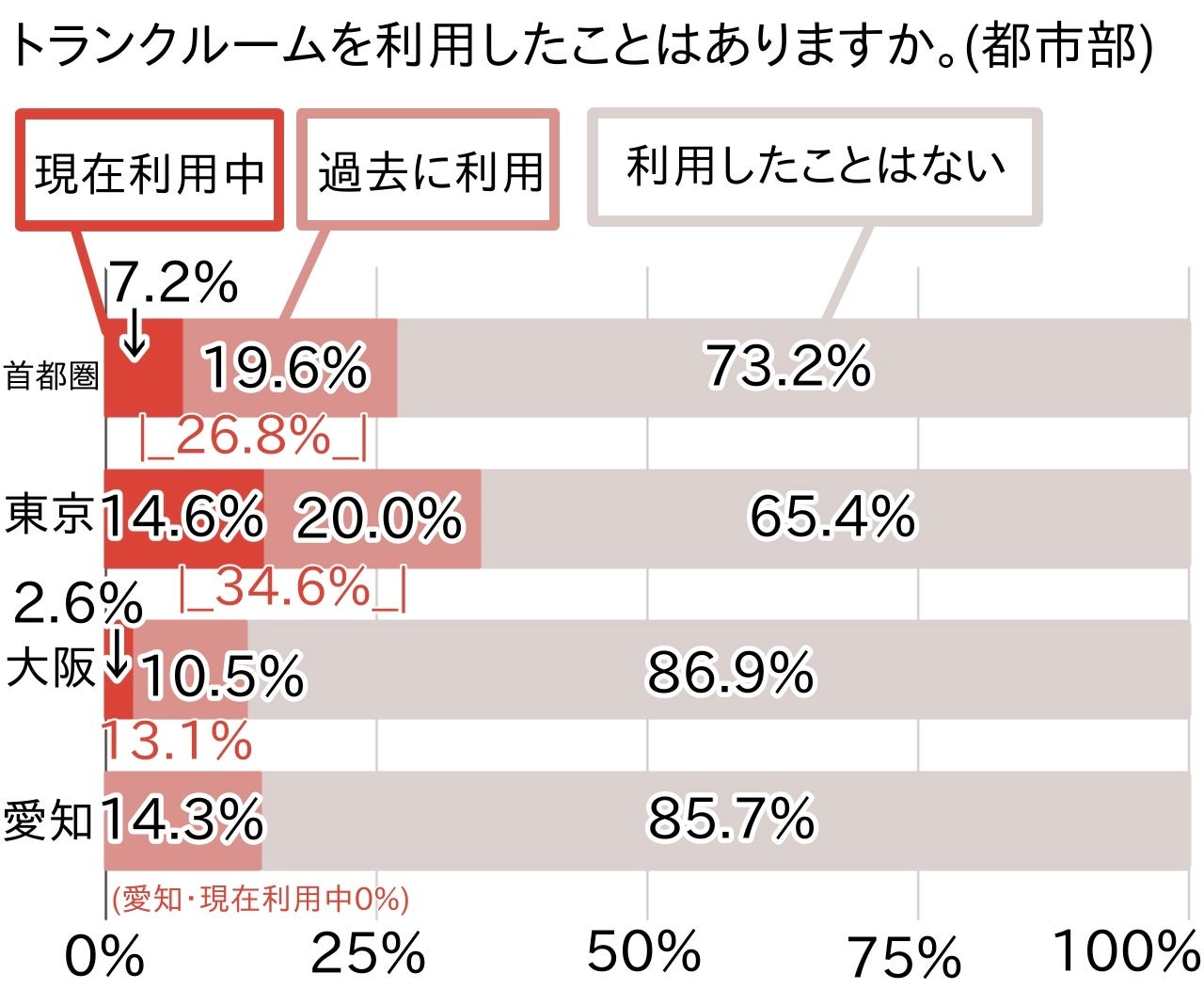 都市部に注目すると、東京を中心とする首都圏でトランクルームの利用経験率が高くなっています。