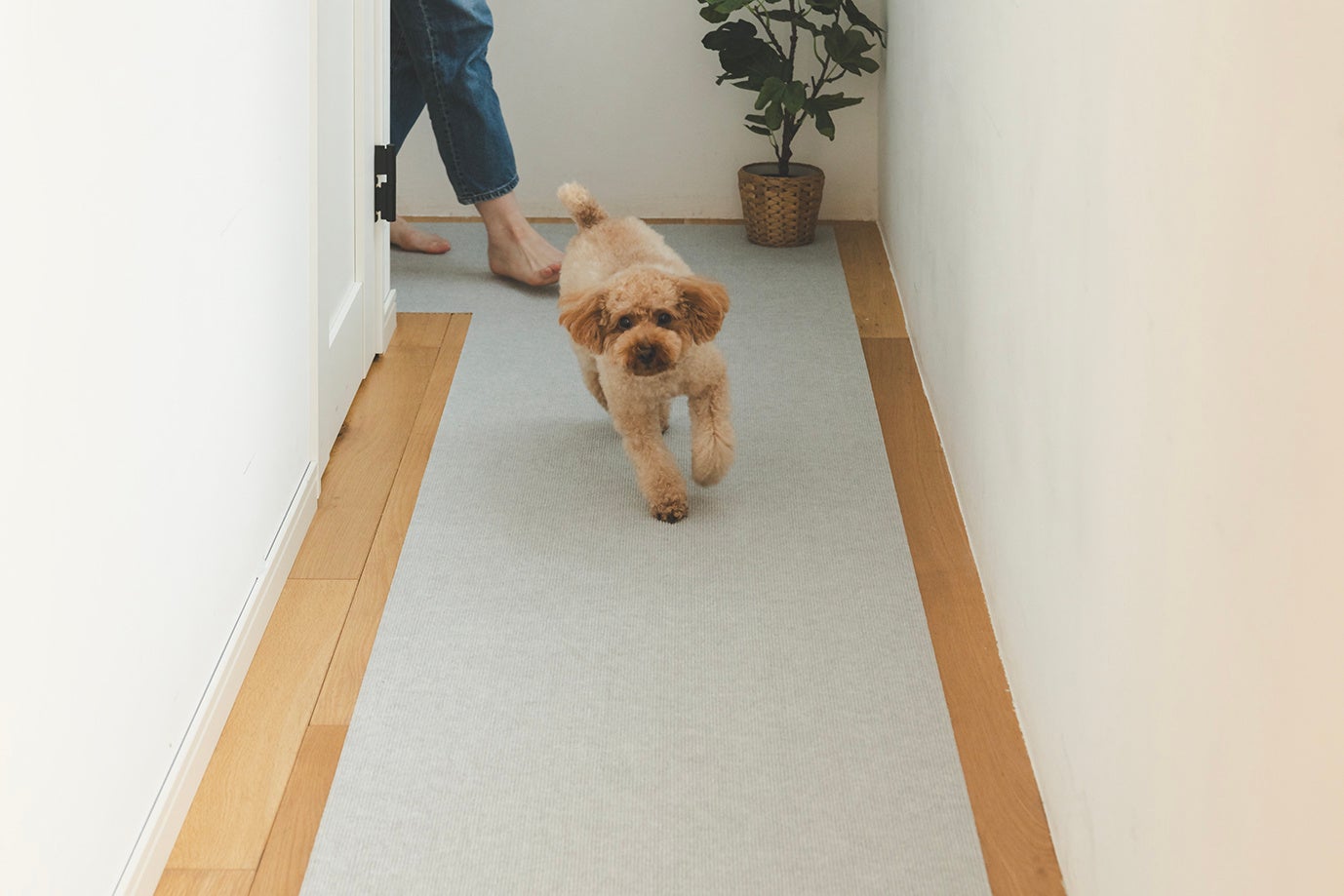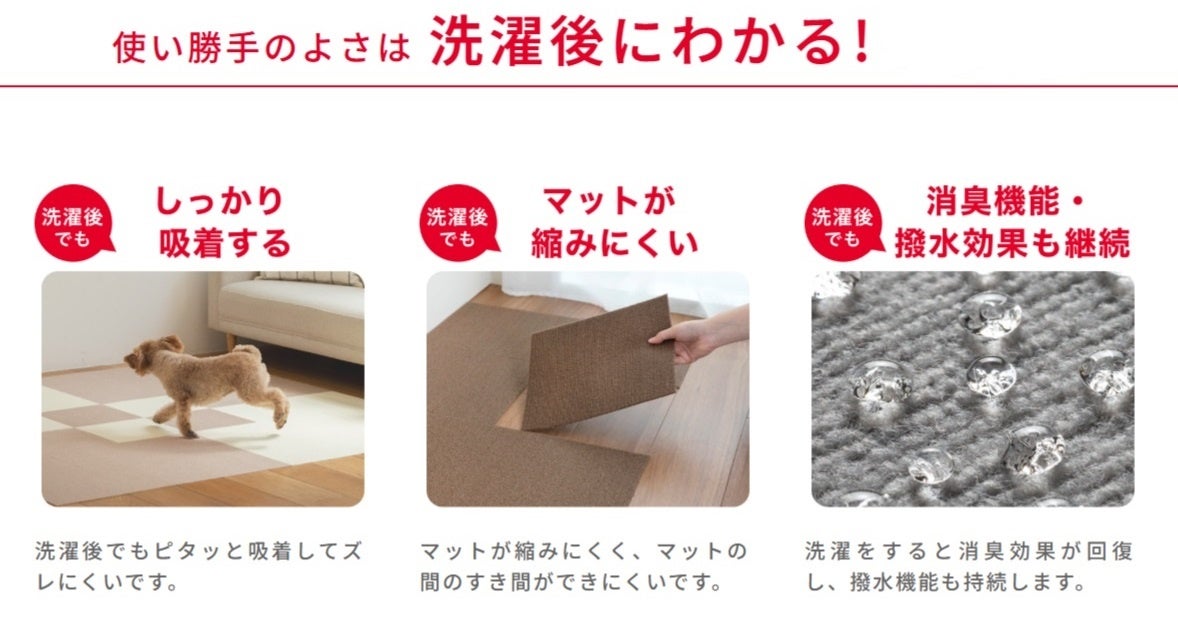 サンコーのタイルマットは、つまずきにくい薄手でありながら、表面はカーペットのような肌触りで滑りを軽減するなどの足腰の負担を軽減するための工夫をしており、実際に利用者の声として「愛犬も滑らず歩きやすそうにしている」「足元が滑らないので元気に走り回ってます」「フローリング時は横滑りなどがあり危険でしたが、こちらの商品で快適に走り回っています」などの反響が寄せられています。足腰の負担軽減のみならず、サンコーの独自素材「おくだけ吸着®」を採用しており、置くだけでマットが床にピタッと吸着し、ペットが動き回ってもマットがズレる心配はありません。その他、消臭、撥水加工の機能性も兼ね備えています。