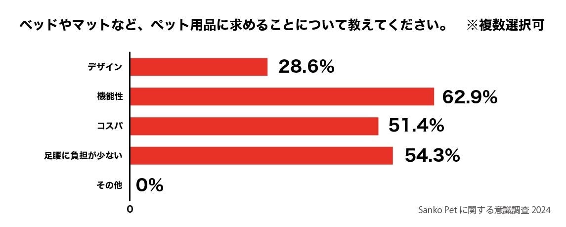 「ベッドやマットなど、ペット用品に求めることについて教えてください」という質問に対して、「機能性」と回答した方は最多の62.9%。次いで、「足腰に負担が少ない」との回答は54.3%という結果に。一方で、「デザイン」と回答される方は28.6%となり、ペット用品に関しては見た目よりも機能性が重視される傾向にあり、ペットの健康を気遣い商品選択をしている方が多いことが分かります。