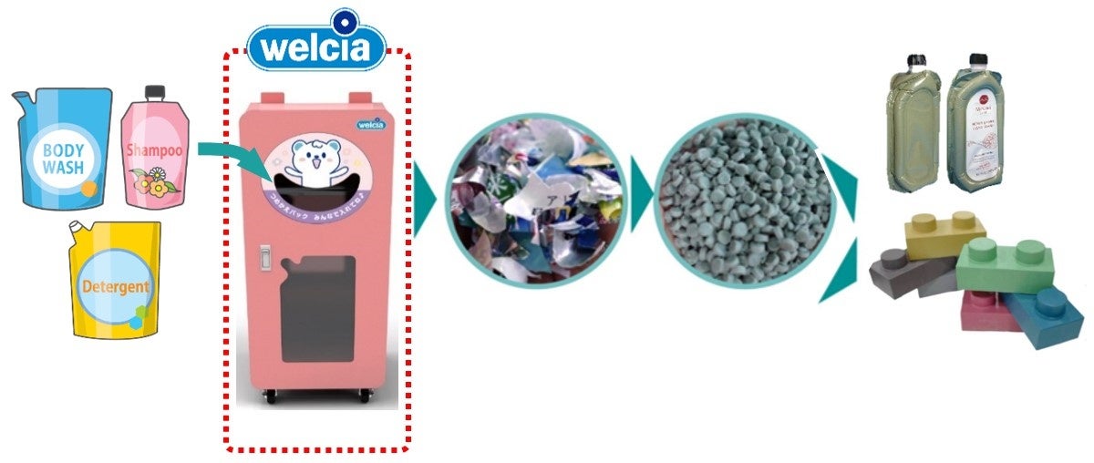 2021年10月より、日用品メーカー、物流会社と協働し、洗剤やシャンプーなどの使用済みつめかえパックのリサイクルを開始しました。41の店舗(2025年5月時点)で回収したつめかえパックを店舗・地域で活用できるブロックなどに再生して地域社会における意識啓発をはかるとともに、再びフィルム容器として利用する水平リサイクルに向けた技術の検討と、よりリサイクルしやすいフィルム容器の設計を目指しています。