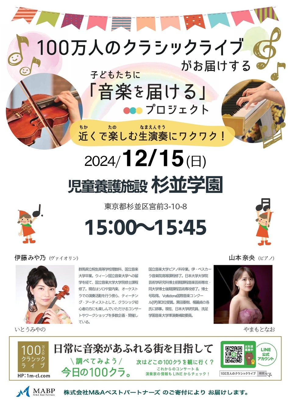 製造、建設、不動産、医療・ヘルスケア、物流、ITに特化したM&A仲介を⾏う株式会社M&Aベストパートナー(本社:東京都千代田区、代表取締役社長:齋藤 達雄 以下M&Aベストパートナーズ)と、一般財団法人100万人のクラシックライブ(東京都千代田区、代表理事:蓑田秀策 以下100万人のクラシックライブ)は、12月15日(日)15:00より、児童養護施設 杉並学園にて、クラシックライブを開催することをお知らせいたします。