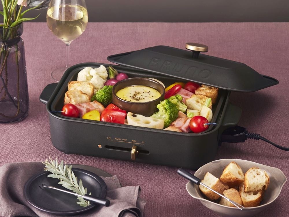 カラフルな野菜やベーコン、バケットを愉しむ、コンパクトホットプレートでつくる彩り野菜のチーズフォンデュ。