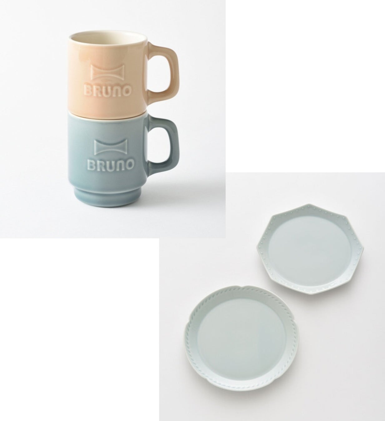テーブルを華やかに彩る2種のセラミックプレートと、BRUNOの大きなエンボスロゴとニュアンスカラーがアクセントのかわいいマグカップ2個をセットにしました。プレートはデザートや料理の取り分け皿として使いやすく、ペアのマグカップはコーヒーやティータイムを愉しく演出します。バレンタインの特別なひとときを、心に残るギフトで演出してみませんか。