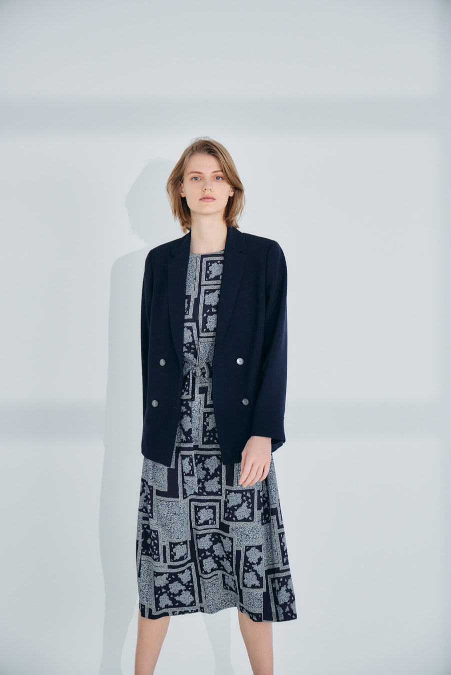 クラシックな佇まいの紺のダブルブレストジャケットを主役に大胆な柄のドレスを合わせたスタイリング。羽織るだけで様になる一枚です。