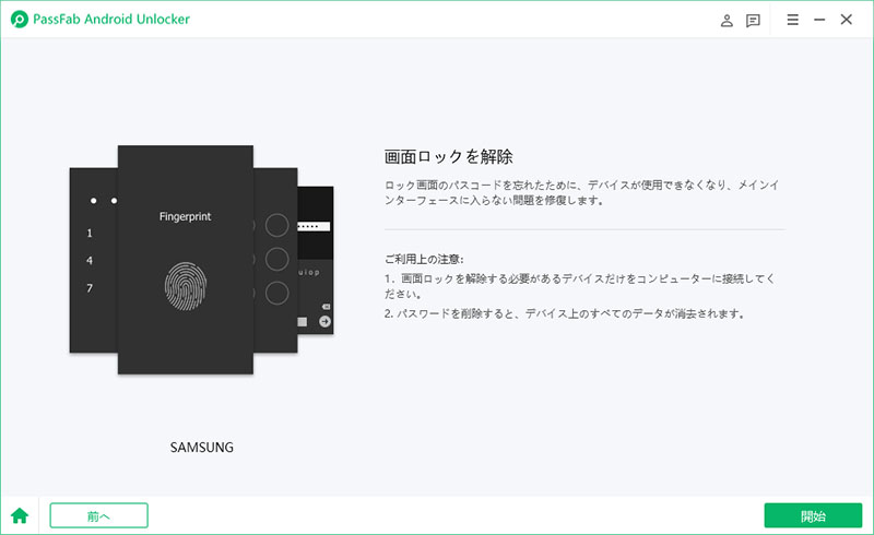 Step1:PassFab Android Unlockをパソコンにダウンロードして起動します。メニュー画面が表示されるので「画面ロックを解除」を選択します。