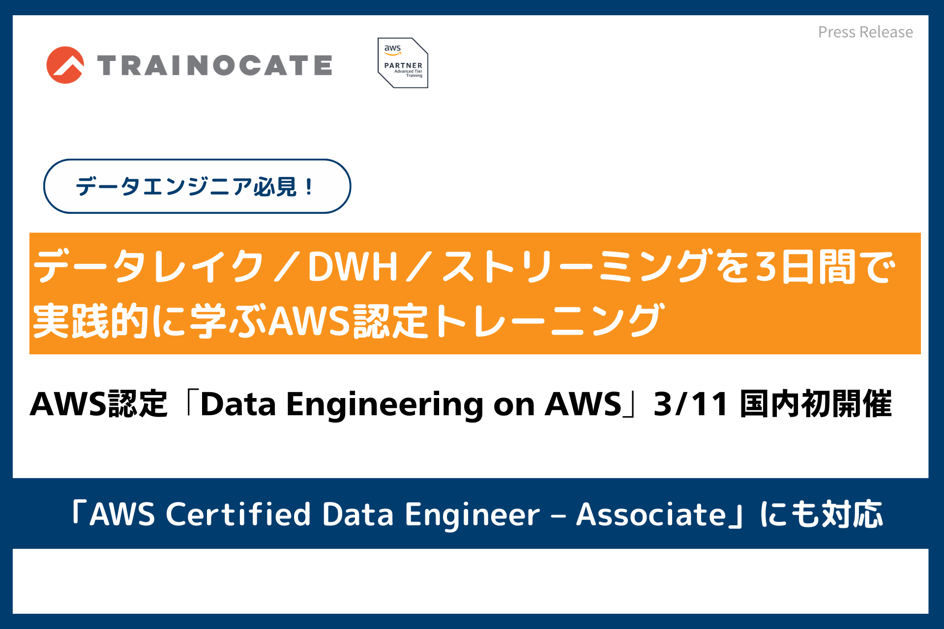 トレノケート株式会社(本社:東京都新宿区、代表取締役社長:早津 昌夫)は、アマゾン ウェブ サービス(AWS)認定トレーニング「Data Engineering on AWS」を、日本語による公式トレーニングとして3月11日より国内で初めて提供開始します。本コースは、AWS上でのデータレイク、データウェアハウス(DWH)、バッチ処理、ストリーミング処理といったモダンなデータエンジニアリング基盤を、3日間で体系的かつ実践的に習得できる中級者向け公式トレーニングです。