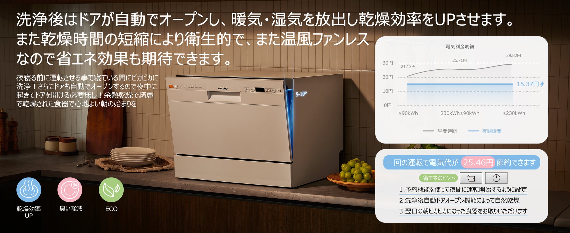 COMFEE'の食洗機は、自動ドアオープン機能で乾燥効率アップ!75℃高温洗浄&大容量で家族の食器もピカピカに。工事不要&節電設計も魅力!
