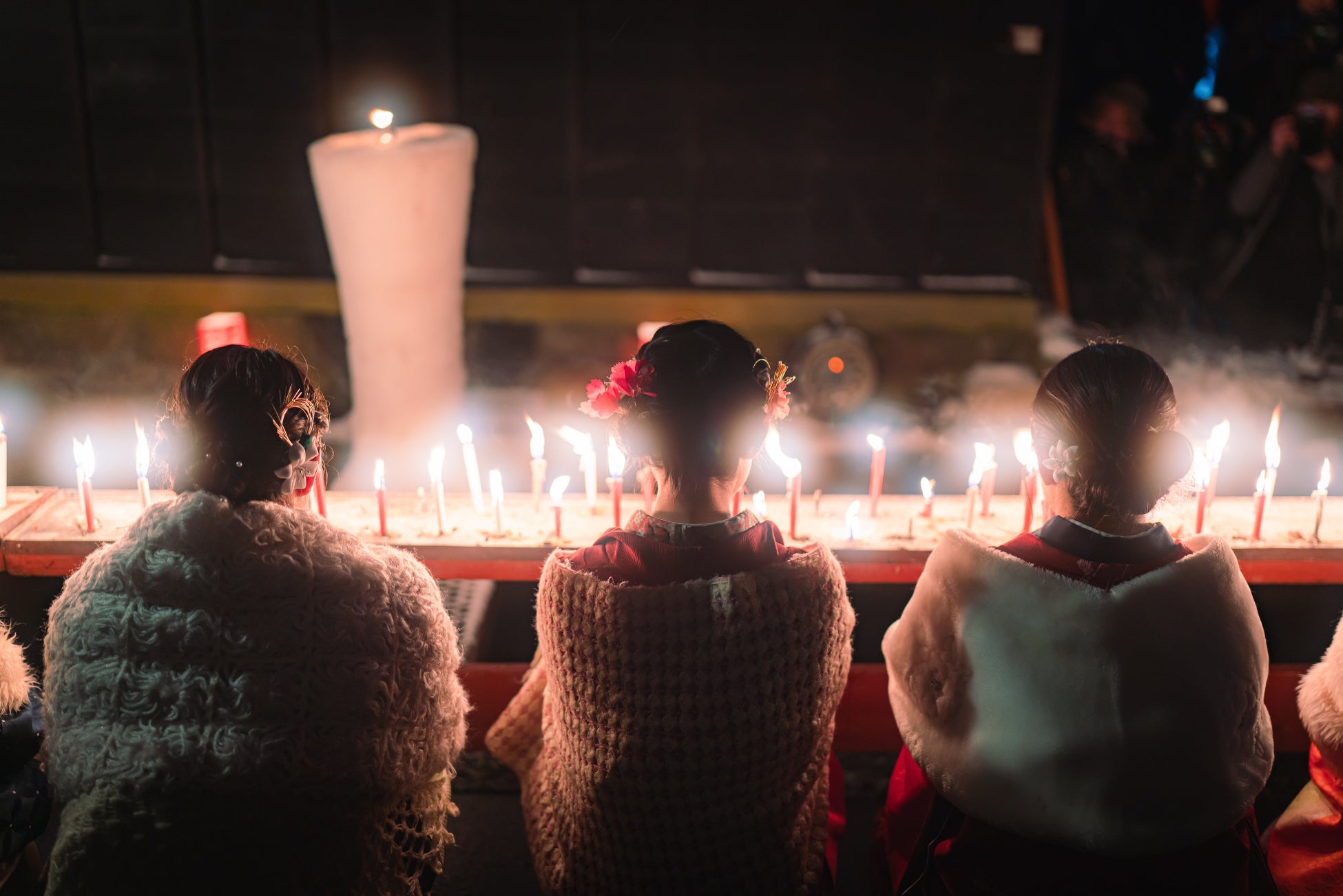 白いろうそくは願いを込めて、赤いろうそくは願いが成就した御礼参りとして火を灯します。千の想いが炎となって、雪の瀬戸川をやさしく照らします。