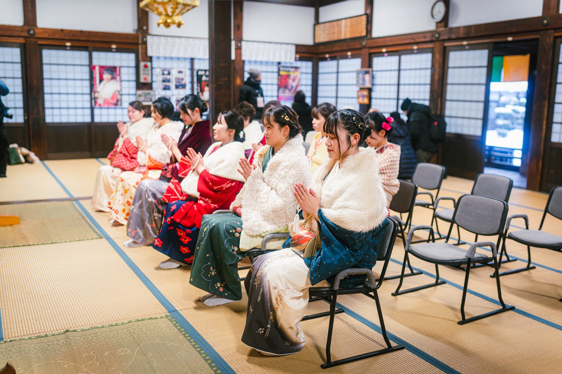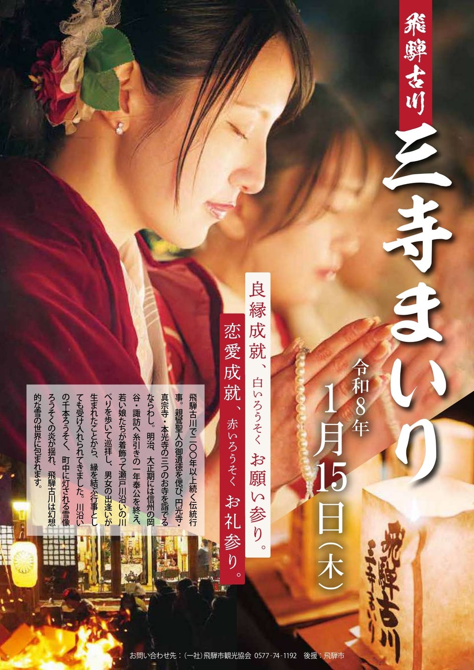 三寺まいりは浄土真宗の宗祖・親鸞聖人の御遺徳を偲び、町内にある円光寺・真宗寺・本光寺の三寺を巡拝する、200年以上続く伝統あるならわしです。明治・大正期には、飛騨から野麦峠を越えて信州の岡谷・諏訪へ糸引きの出稼ぎに出た女性たちも、一年の奉公を終えて帰省し、この日に着飾って瀬戸川沿いを歩いて巡拝したことから、男女の出会いが生まれ、やがて縁結びの行事としても知られるようになりました。