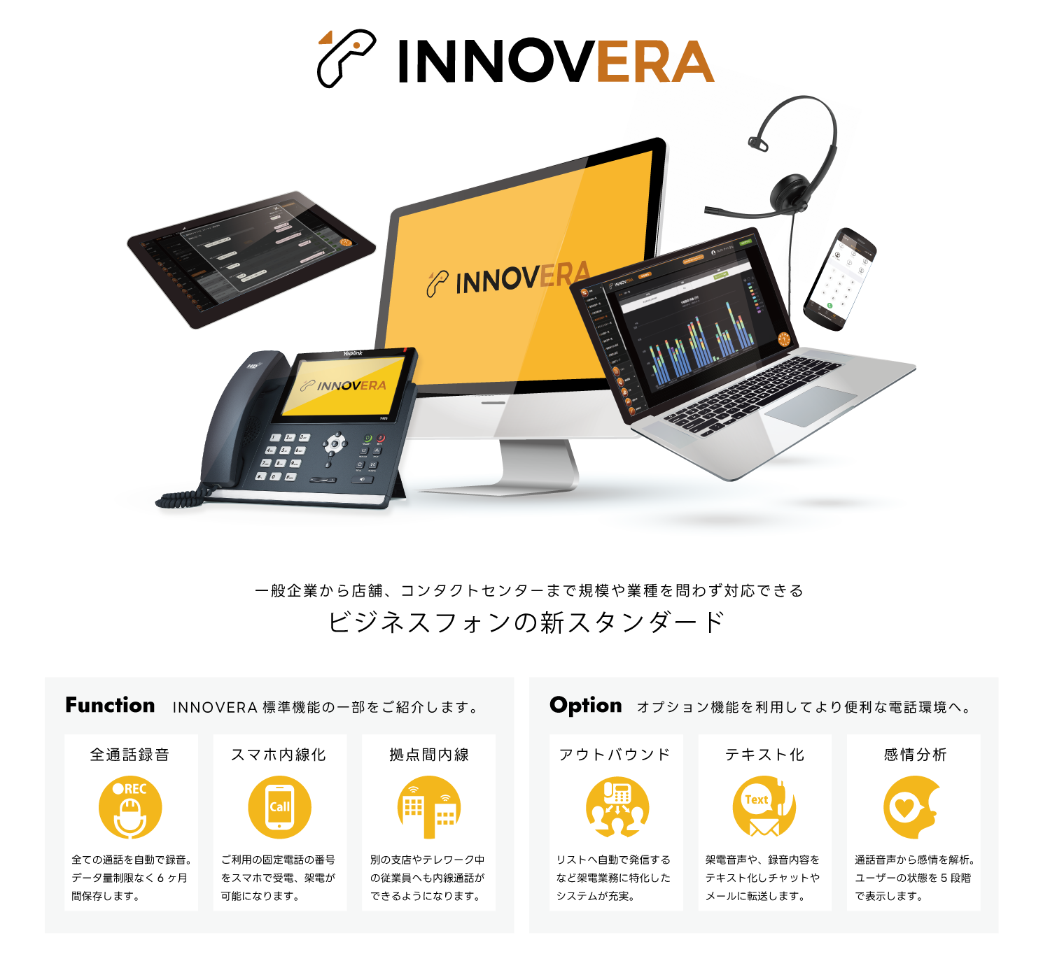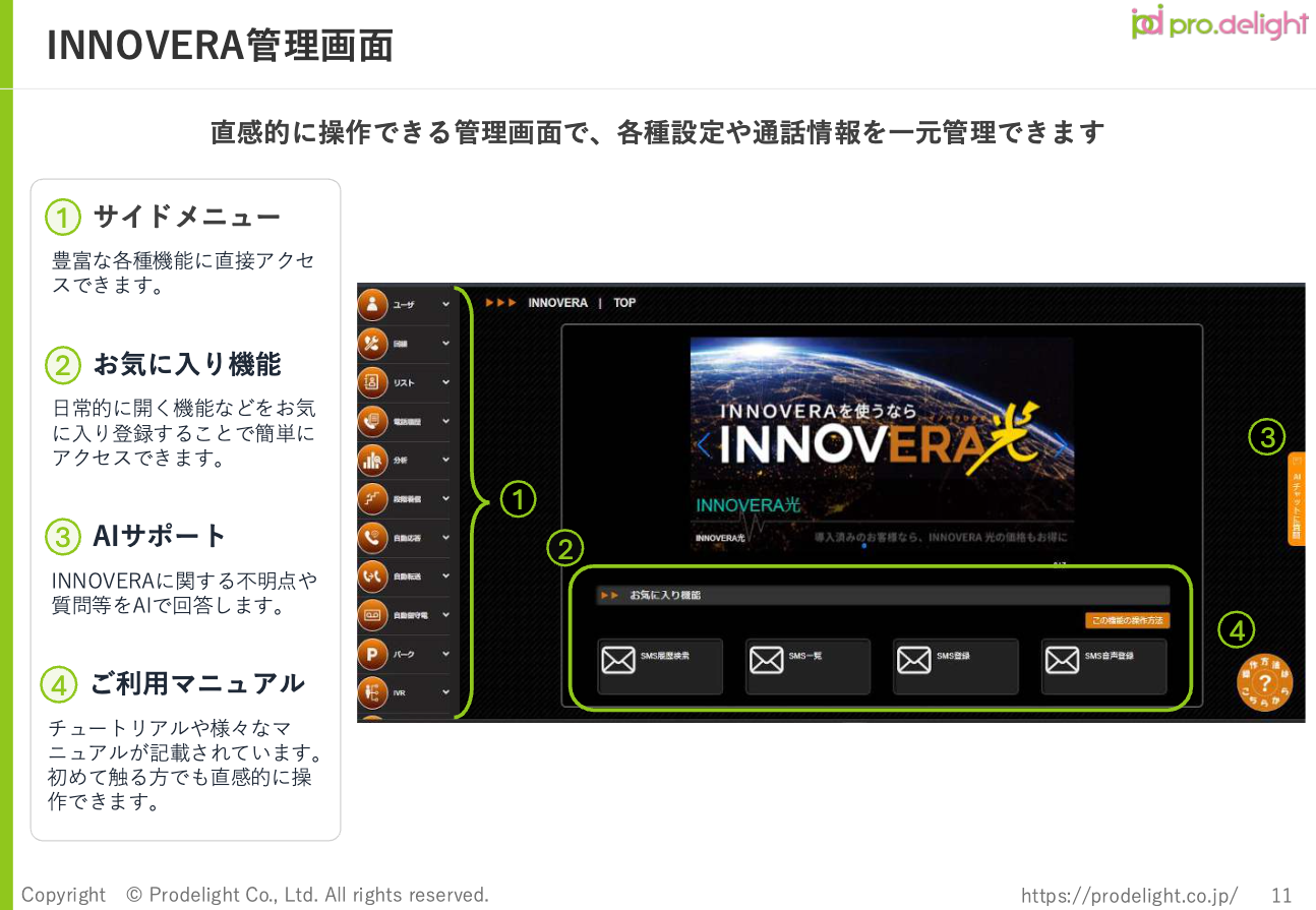 プロディライトは、「電話のDX」を推進するクラウドPBX「INNOVERA」(https://innovera.jp/)を提供しています。INNOVERAは、スマートフォンやPCにて会社の電話番号の発着信を可能にした現代の働き方に適した電話環境を提供する“Japan Quality”の国産クラウドPBXで、ビジネスフォン用途はもちろん、少人数のコールセンターの立ち上げ等、様々な用途に対応することもできます。