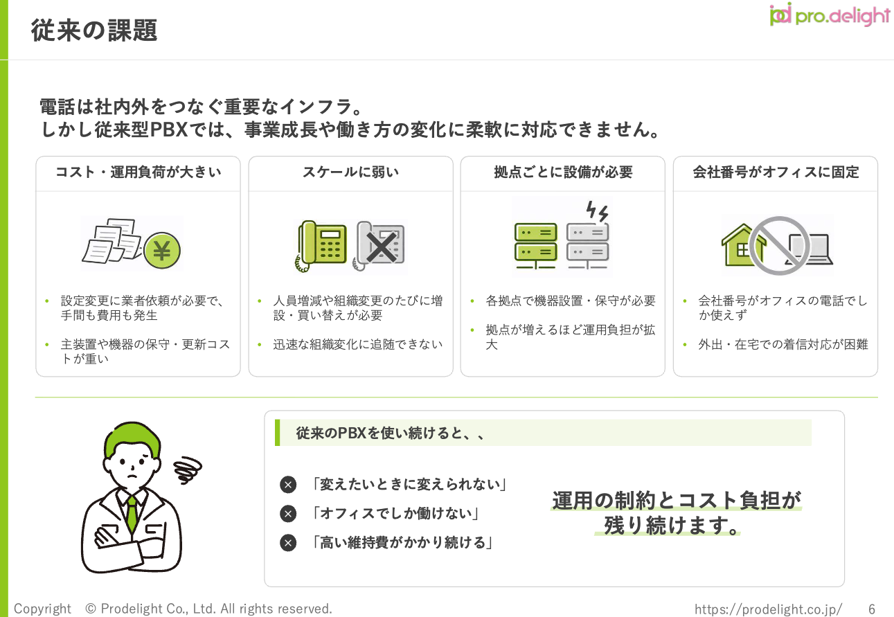 また、INNOVERAに加え、プロディライトが提供する回線サービス「IP-Line/Free-ProLine」についての内容も記載し、社内稟議や導入を円滑に進めていただくために必要な情報も盛り込んでおります。クラウドPBXの導入をご検討中の企業様はぜひご確認ください。