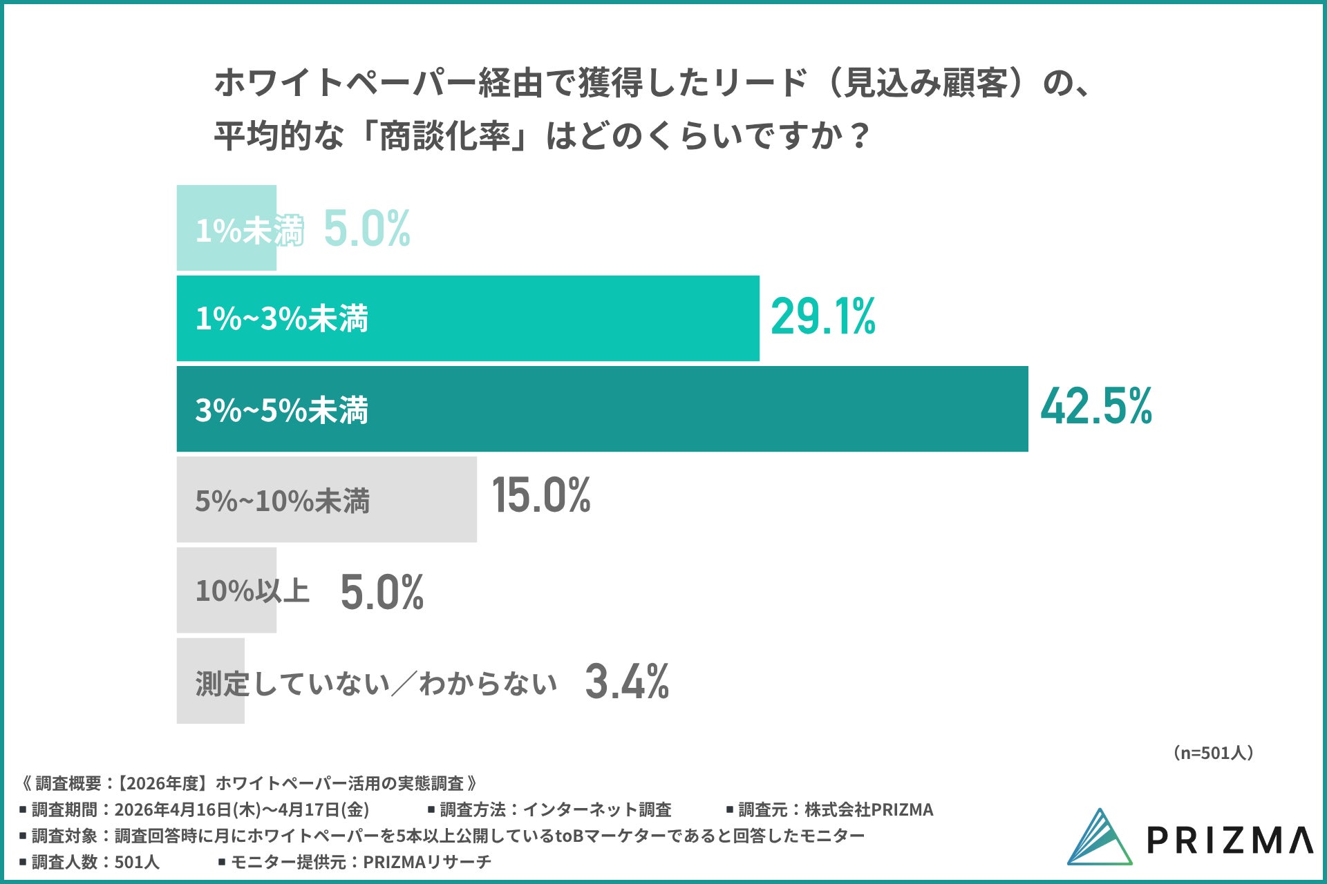一般的に、ホワイトペーパー経由の商談化率は3〜5%程度が一つの目安とされており、本調査結果も市場水準に沿った結果といえるでしょう。