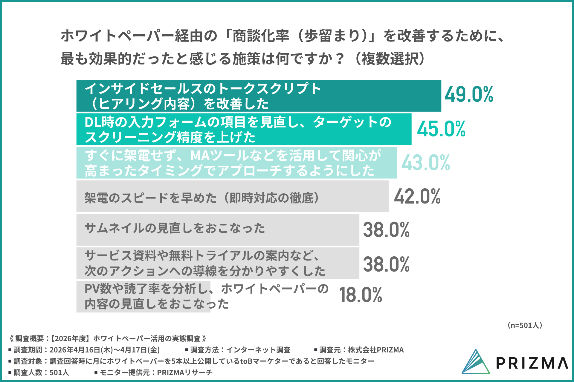これらの結果から、ホワイトペーパーの成果はコンテンツの質だけでなく、リード獲得後のアプローチ設計や運用によって大きく左右されることが示唆されます。
