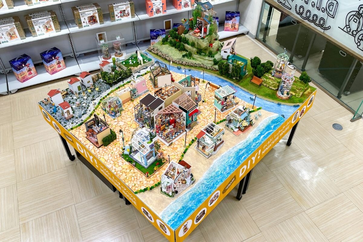 今回ハンズ 銀座店に設置しているのは、大きさ約2m四方の迫力あるジオラマです。つくるんです®のミニチュアハウスを合計27個使用しており、ミニチュア好きの方やつくるんです®ファンにとって、魅力的な空間に仕上がっています。