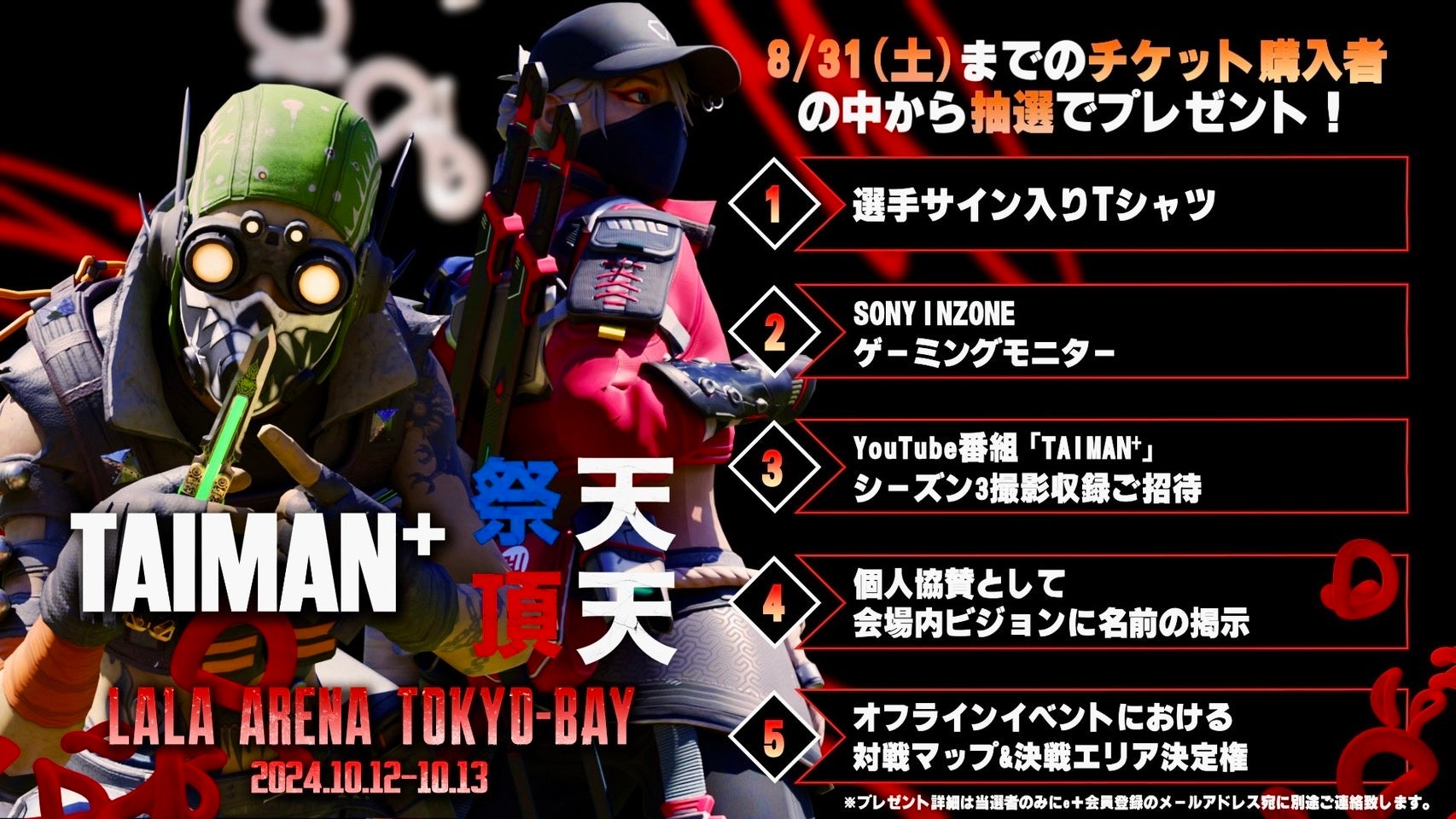 8月31日(土)までに「TAIMAN+」オフライン大会のチケットをご購入された方の中から、抽選でプレゼントが当たります。チケットの購入はお早めに。