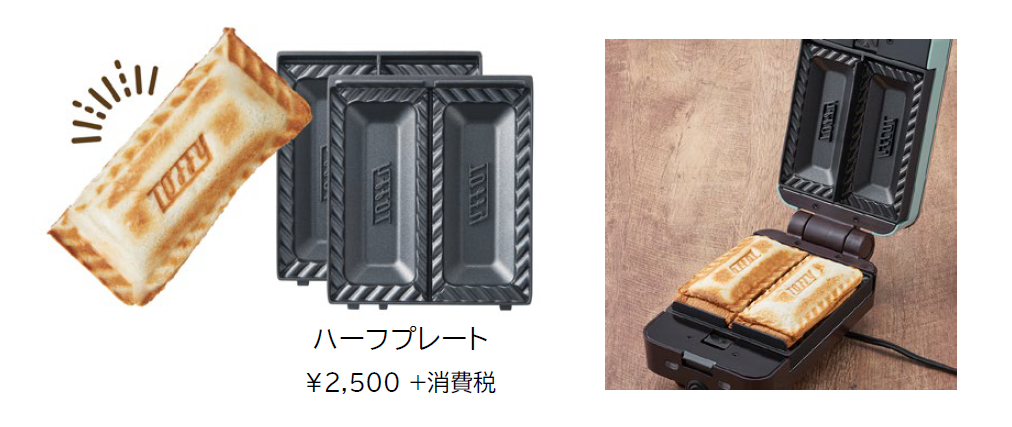 別売の「ハーフプレート」では、ハーフホットサンドもつくれます。食パン1/2の食べきりサイズで、朝ごはんやサクッとランチにも最適!