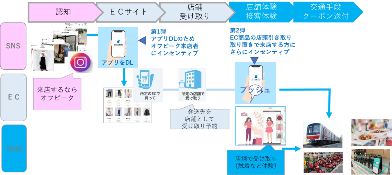 「大阪は、おしゃれしてゆったり歩くといいことがある!」をテーマに、大阪府大阪市(梅田地区および京橋地区)ターミナル駅周辺の商業施設やアパレルショップにおいて、施設の買い物ピーク時間を避けて来店いただいた方への特典の付与を行うキャンペーンを第1弾として実施。第2弾はアパレルEC商品の店頭受け取り及び取り置きのシステムを活用し、事前から来店を予定されるお客様に対して、シェアサイクルの利用券や鉄道無料券の配布を行うことで、混雑の回避とコロナ禍で低下したリアル店舗での集客の回復を目指します。