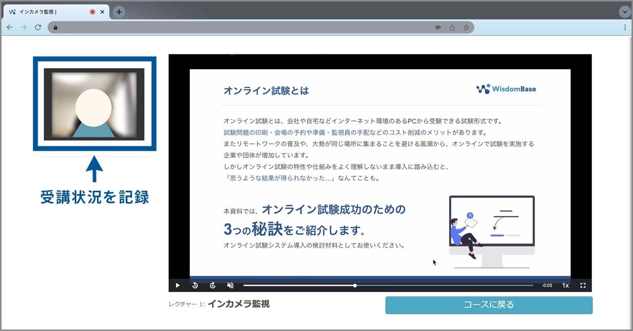 動画レクチャーやPDFレクチャーなど、WisdomBaseで使用できるすべてのレクチャーで、受講中の様子をインカメラで監視できるようになります。