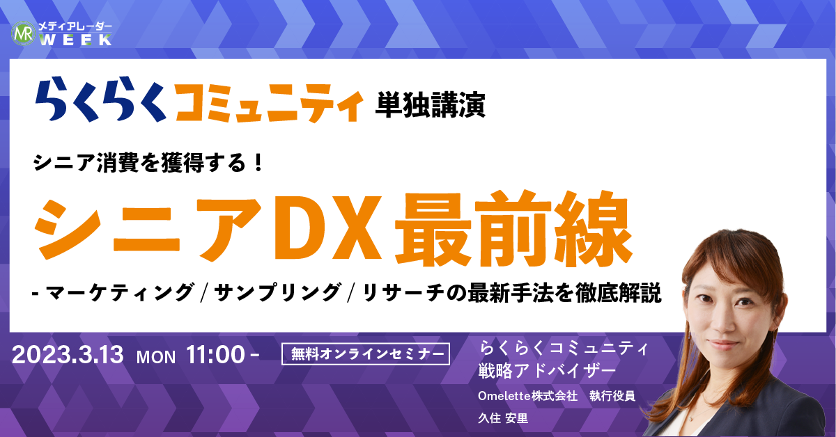 株式会社アイズ(所在地:東京都渋谷区、代表取締役社長:福島範幸、東証グロース:5242)が運営するNo.1*の媒体資料ポータルサイト「メディアレーダー」が主催するマーケティングセミナーイベント、「第9回メディアレーダーWEEK 2023春」にて、シニア消費の活性化・DXのエキスパート、らくらくコミュニティの戦略アドバイザーの久住安里(Omelette株式会社執行役員)が3/13(月)に登壇します。参加申し込みは無料です。