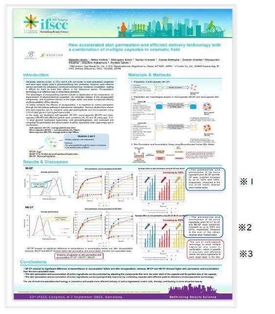 ジェイフロンティア株式会社(本社:東京都渋谷区、代表取締役社長執行役員:中村 篤弘)は、「人と社会を健康に美しく」を経営理念に掲げ、人々の健康増進・生活の質向上に資する自社オリジナル医薬品・健康食品・化粧品の販売といったD2C事業(EC・通販事業)を展開しております。東洋ビューティ株式会社との共同で、複数カプセルの組み合わせによる新たな皮膚浸透促進・効率的なデリバリー技術研究を行い、その成果を第33回大会「IFSCC(国際化粧品技術者会連盟)学術大会/バルセロナ大会(2023年9月4日~9月7日)にてポススター展示発表致しました。