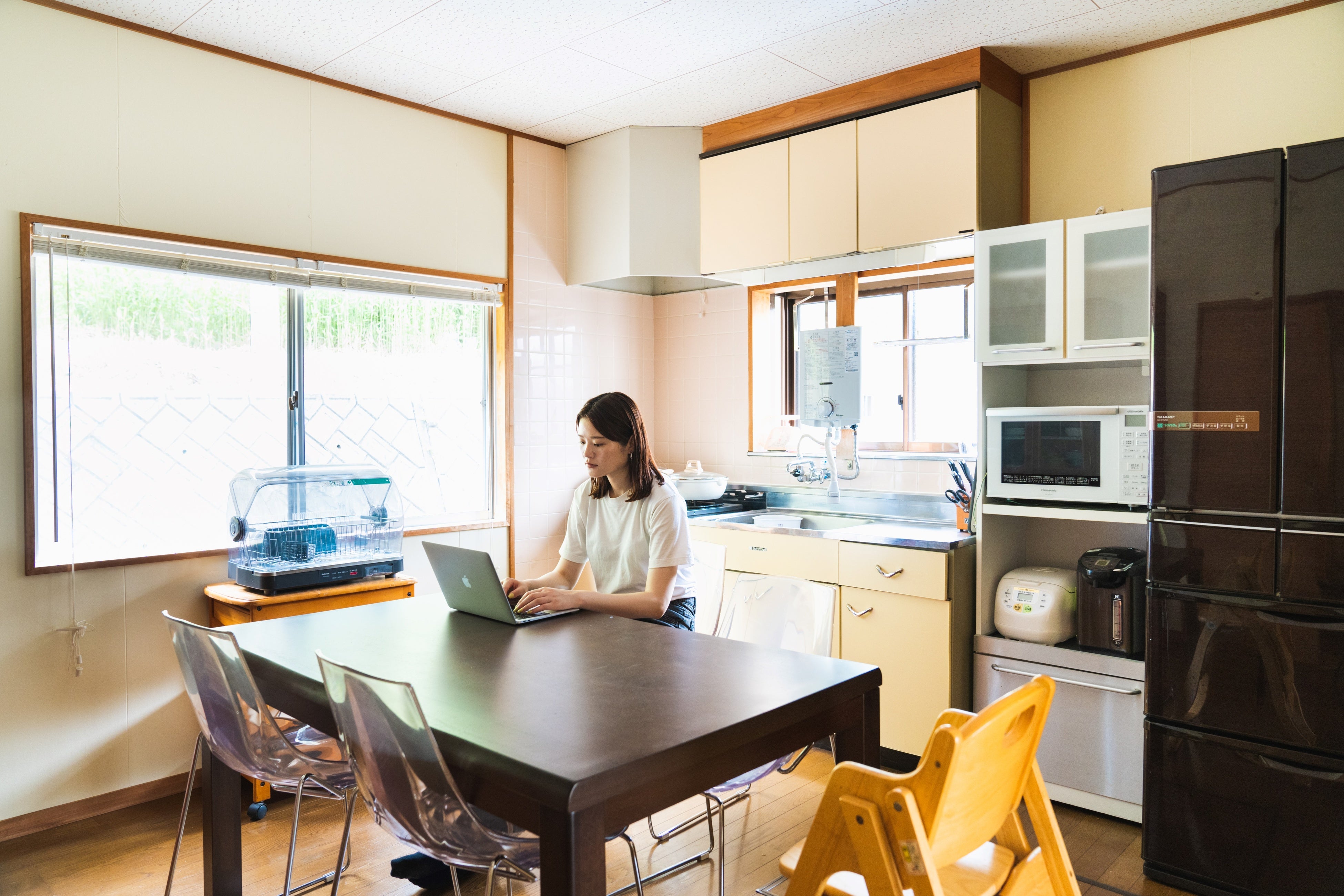 こども園から徒歩15分・車で5分ほどの距離にあるのが、暮らしの拠点になる3DKの一軒家。リビングや和室、ダイニングキッチンとスペースが充実し、生活設備も揃っています。山や川が近く、お散歩にも最適の立地です。仕事面では、Wi-Fi環境が完備され快適。ダイニングテーブルは仕事をするにもちょうどよく、隣接した和室で遊ぶ子どもを見守りながら作業をすることも。縁側スペースでひと息つくのもおすすめです。