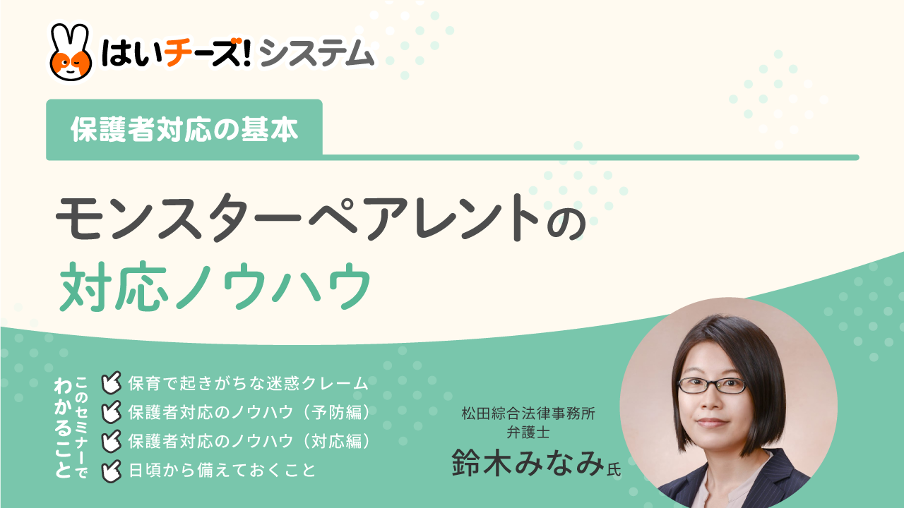 今回のオンラインセミナーでは、保護者対応分野で経験と実績が豊富な松田綜合法律事務所の鈴木先生を講師にお招きし、保育施設で起こりがちな迷惑クレームの対応について判断基準、具体的な対応ノウハウ、施設として日頃から備えておくべきことなどをお話いただきます。