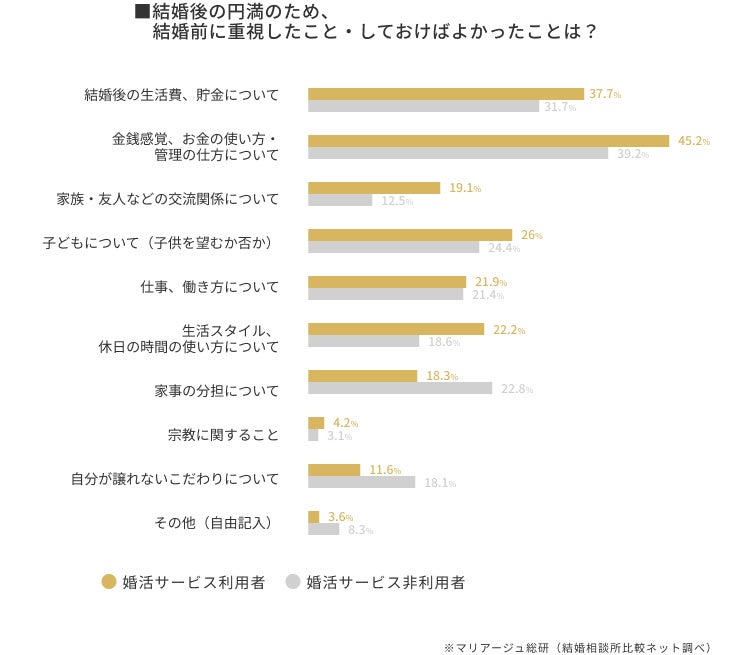 続いて婚活サービスを利用して結婚した夫婦とそうでない夫婦それぞれに「結婚後の円満の為、結婚前に重視した・しておけばよかったこと」について尋ねました。両夫婦とも生活費や貯金、お金の使い方や管理の仕方など、お金に関係する項目の回答率が最も高くなっており、いずれかの項目を選んだ人は全体のおよそ3分の2以上と、多くの人がお金に関する悩みを抱えているようです。また、「家事の分担について」「自分が譲れないこだわりについて」は、婚活サービスを利用していない夫婦の方がそれぞれ約1.2倍、約1.5倍高い回答率を見せました。