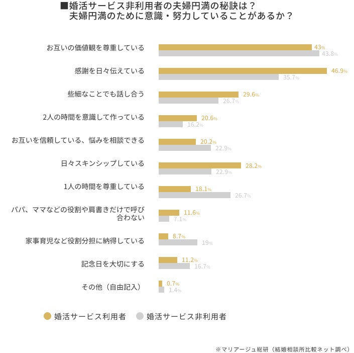 まず婚活サービスを利用して結婚した夫婦の回答を見てみると、婚活サービスを利用していない夫婦に比べ、全体として「感謝を日々伝える」、「二人の時間を意識的につくる」、「日々スキンシップを取る」の回答率が約1.2~1.3倍高い結果となりました。