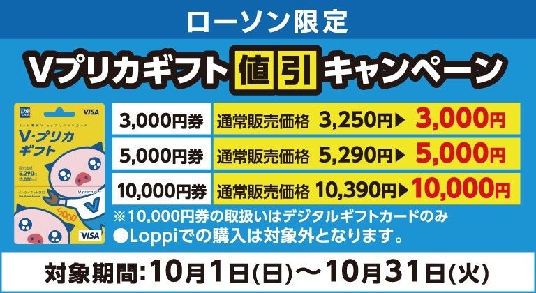 キャンペーン期間中、ローソン店内のギフトカードコーナーにあるVプリカギフトを購入すると、通常価格よりお安くお求めいただけます。