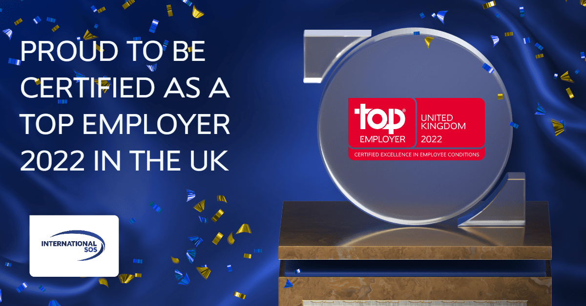 2022年6月 – 世界中で働く従業員の健康と安全を支えるためのソリューションを全世界のクライアントに提供するインターナショナルSOS(日本法人本社:東京都港区 代表取締役 マーク・アタウェイ)は、4年連続でイギリスのトップ・エンプロイヤー(優れた雇用主)に認定されました。Top Employer’s Institute(以下TEI:トップ・エンプロイヤー協会 https://www.top-employers.com/en/)によって認定されたのは、イギリスでは84社のみで、インターナショナルSOSの人材優先の継続的な成長が認められました。