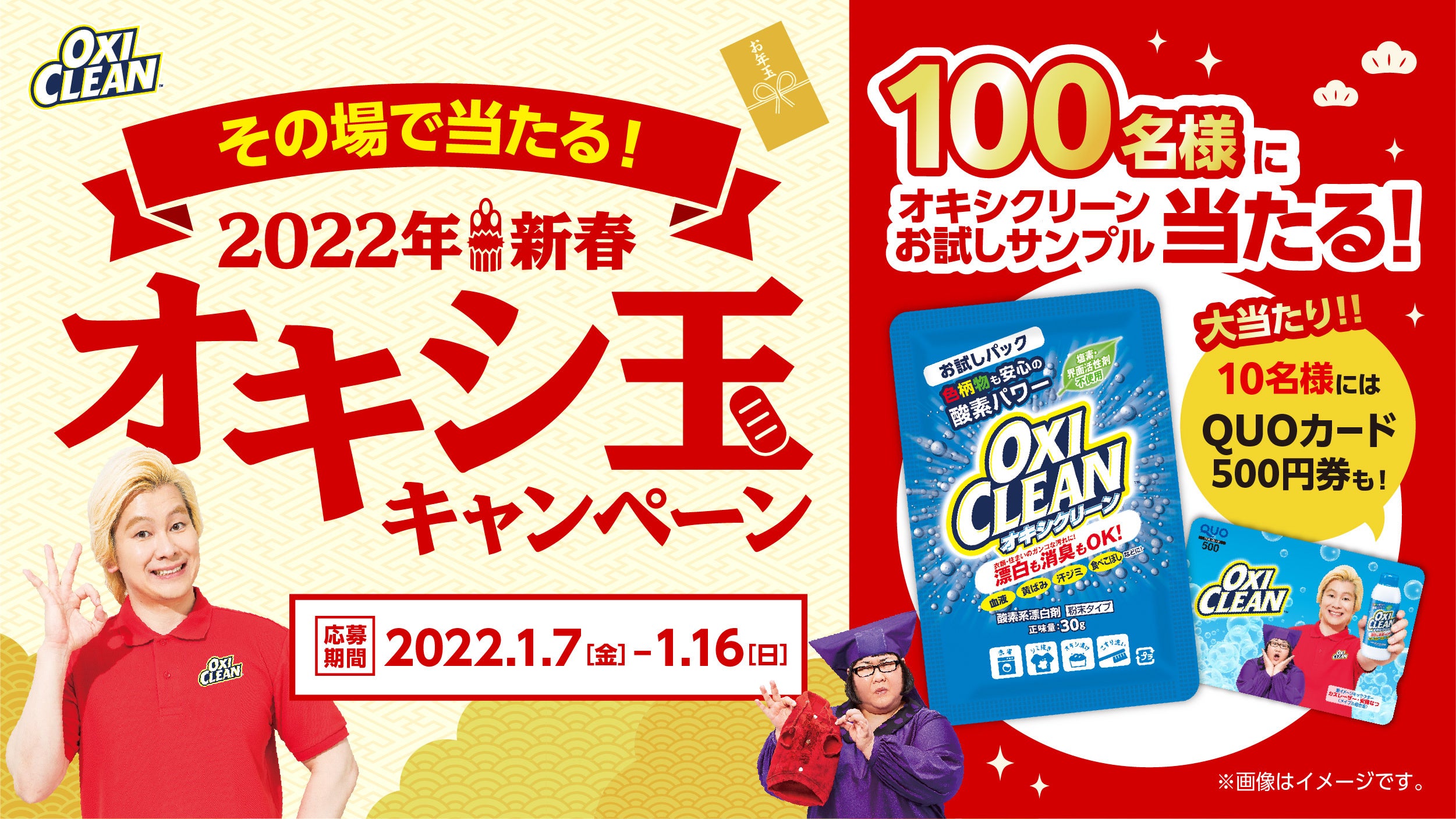 題して「その場で当たる! 2022年新春オキシ玉キャンペーン!」抽選で100名様に「オキシクリーンお試しサンプル 30g」をプレゼントいたします。内10名様には大当たりとして「メイプル超合金QUOカード 500円券」も同封いたします!