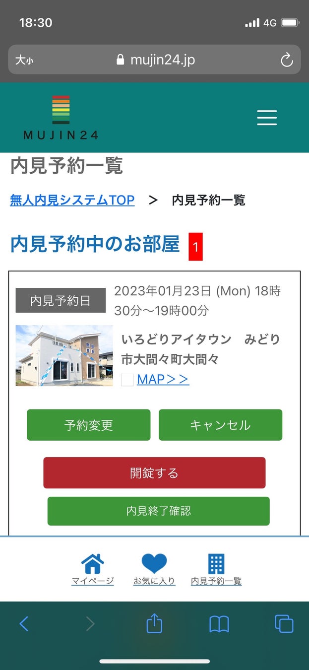 ①現地到着後、マイページにログイン。内見時間になると「物件の鍵を操作する」が表示されるのでタップ。