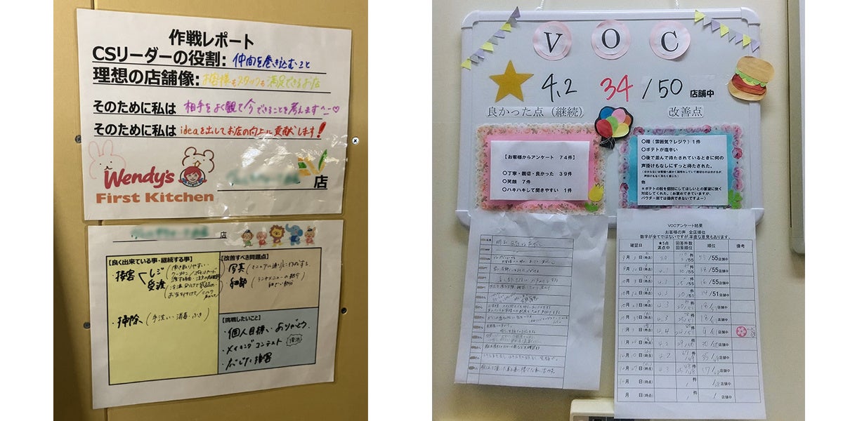 ▲スタッフルームで取り組み内容やアンケート結果を共有している。実行した結果がお客様の声や点数となって「見える化」されることで、店舗運営に参加している意識が醸成され、ESの向上にも寄与する