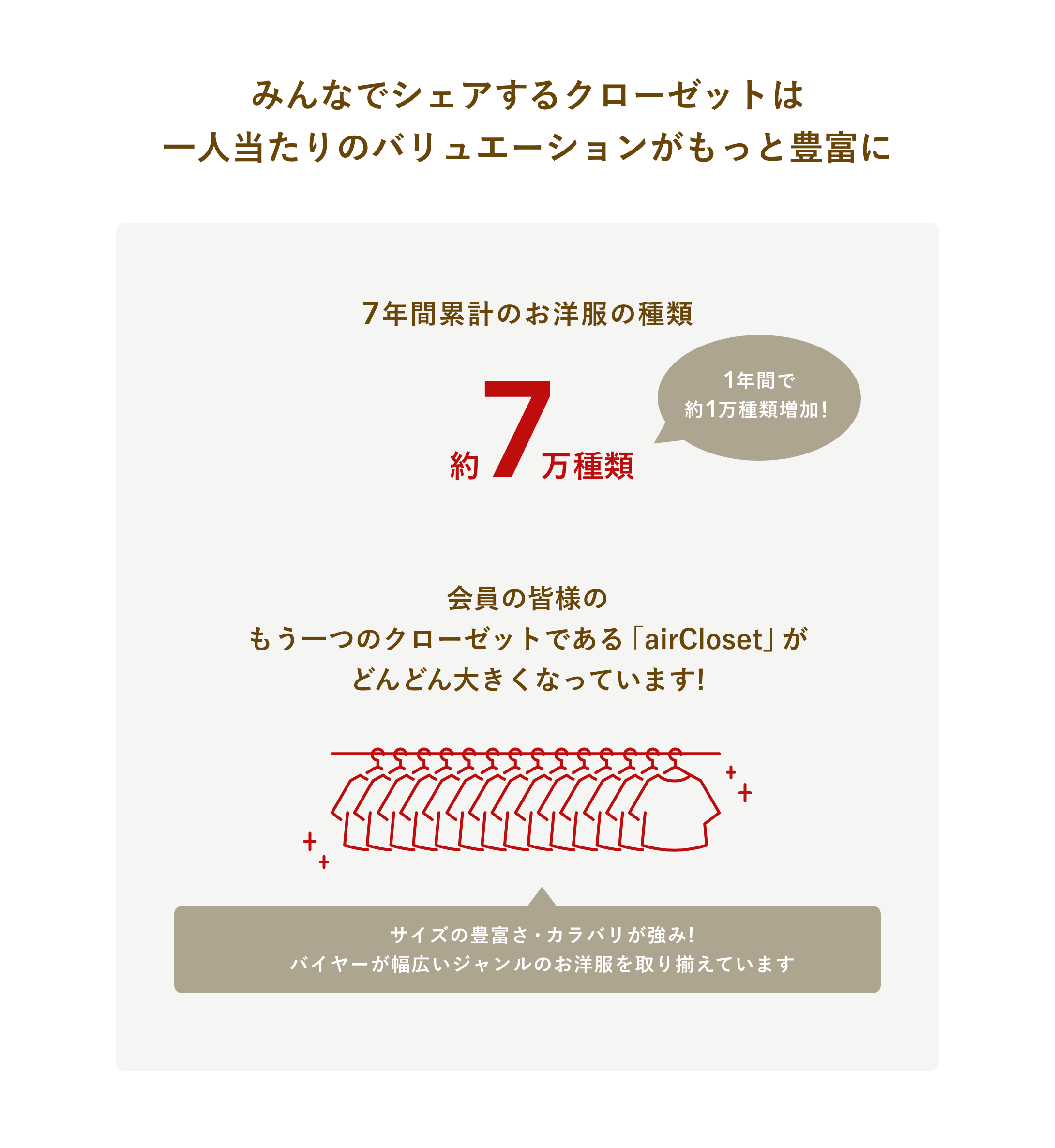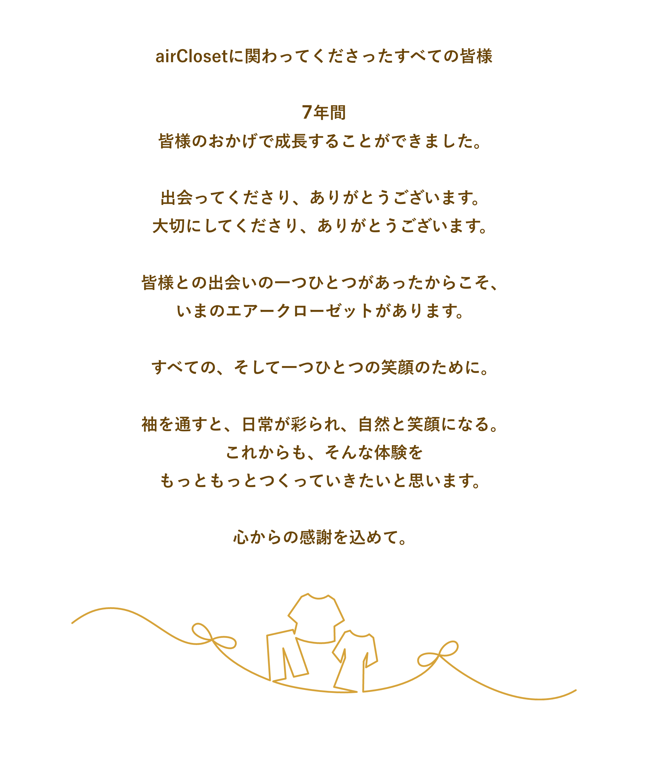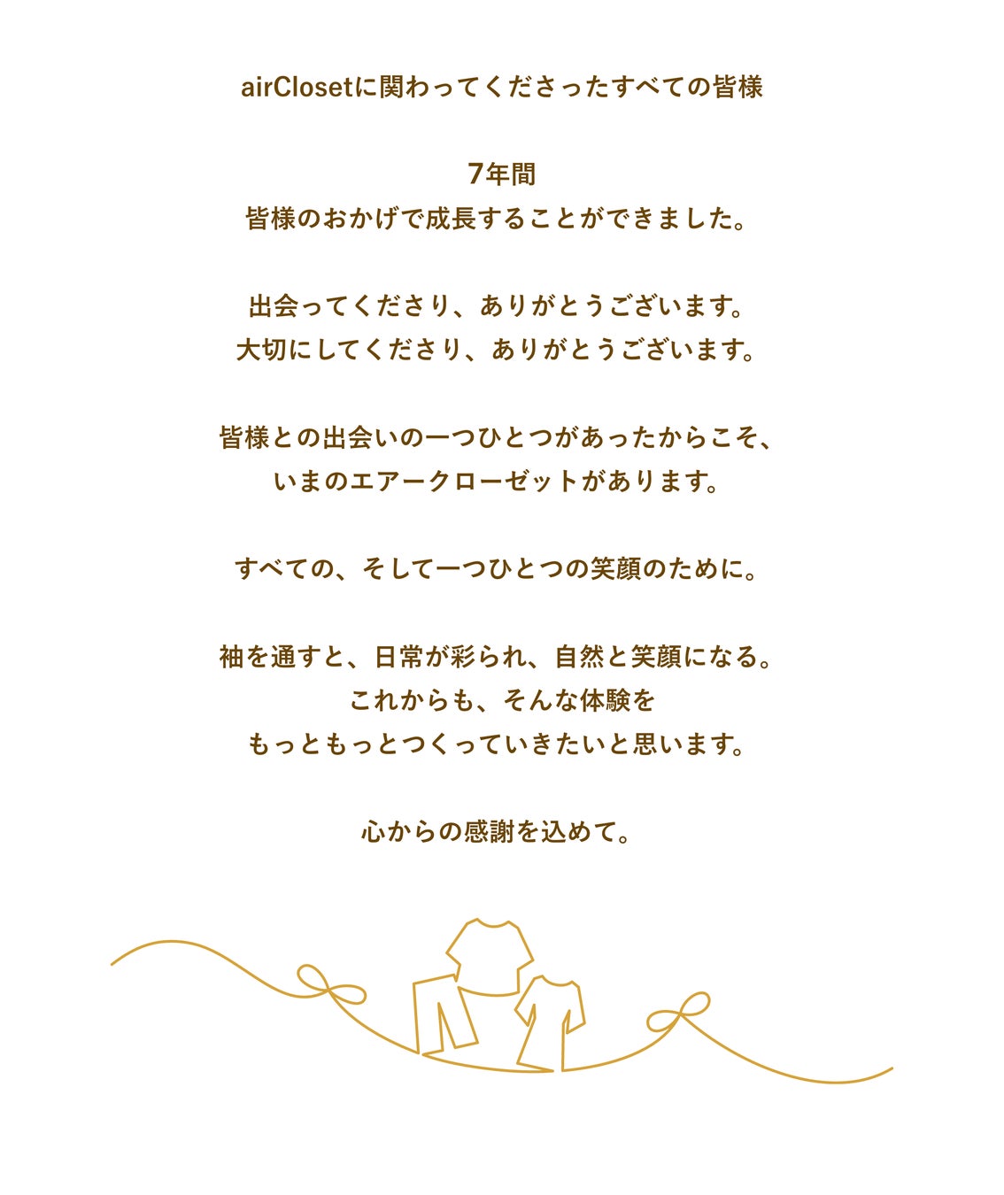 また、「400万回以上のお洋服との出会い」をお届けする裏側には、お洋服を提供してくださるブランド様や、お客様の好みやライフスタイルに合わせ、1着1着お洋服のコーディネートを選んでくださるスタイリストの皆様、お洋服を運んでくださる物流業者様、返却されたお洋服をメンテナンスしてくださる協力会社様がいらっしゃいます。こういった方々のサポートがあり7周年を迎えることができました。誠にありがとうございます。