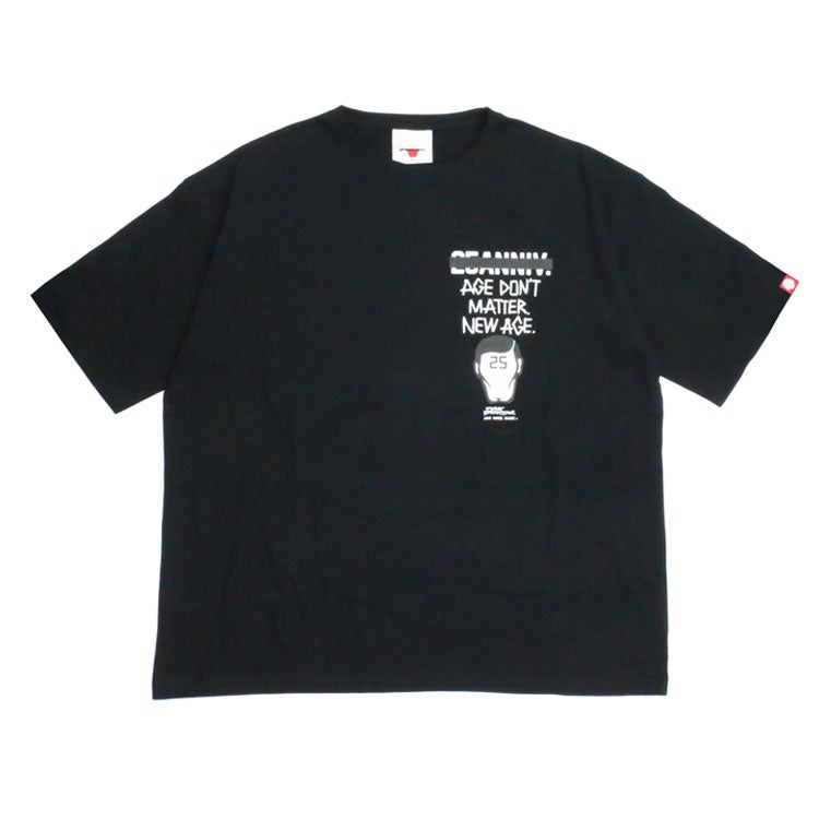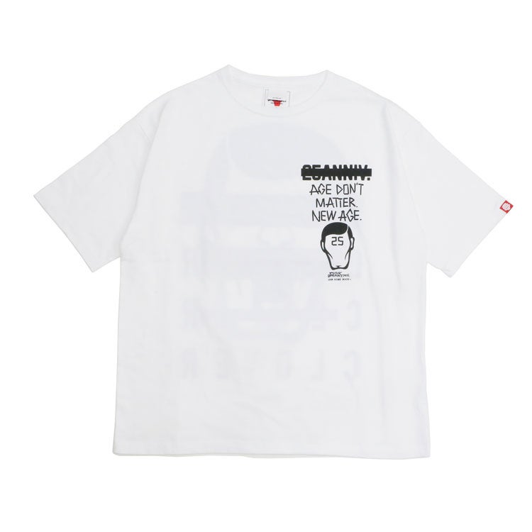 フロントは左胸に25ANNIV.を黒バーで隠した周年ロゴと、アニバーサリーイヤーのコンセプトである「AGE DON‘T MATTER. NEW AGE」のロゴ、そして額に25の文字のみを記された表情の無い“あいつ”。