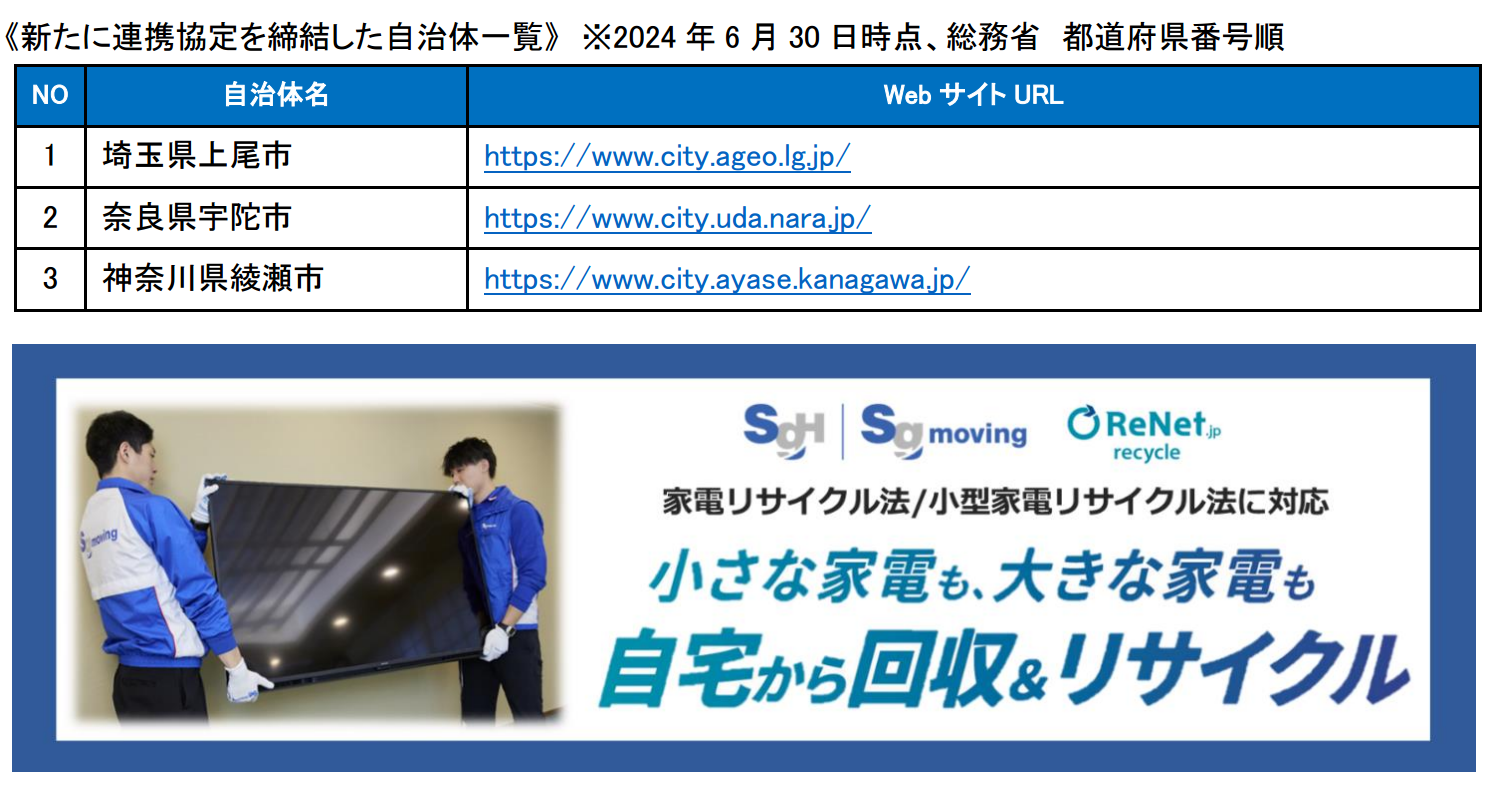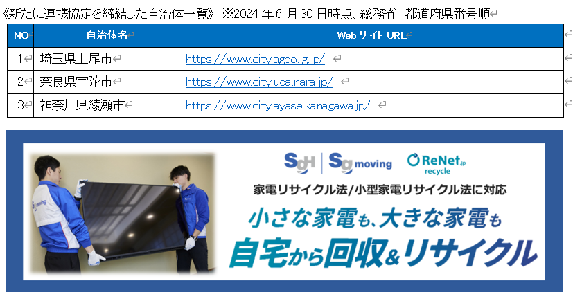 SGムービングとリネットジャパン 新たに3自治体と協定を締結自治体公認の「大型家電の便利な回収サービス」は120自治体に拡大