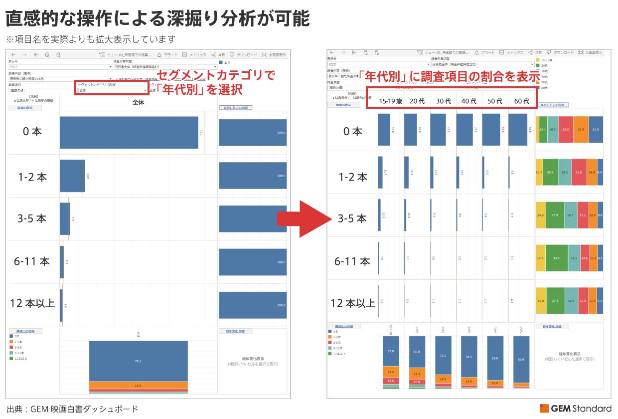 本商品は、オンラインツールの採用により、直感的な操作で対象を絞り込んでいく深掘り分析や、探索的データ分析を可能としているのも特徴です。また、深掘り分析時の軸として、これまで「性別」「性年代別」「鑑賞本数別」といったセグメントカテゴリを提供していましたが、今回のアップデートにあわせて要望の高かった「年代別」「年代別×鑑賞本数別」を追加いたしました。