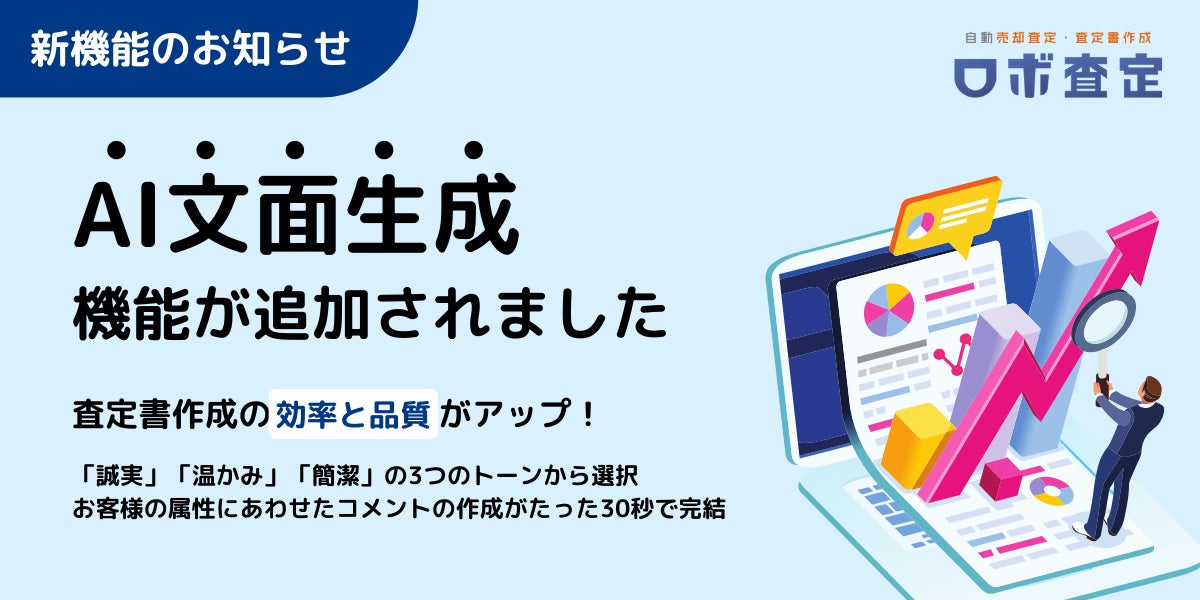 不動産ビッグデータを活用した査定書作成ツール「ロボ査定」を提供するマンションリサーチ株式会社(本社:東京都千代田区、代表取締役社長:山田 力)は、このたび新機能として【AIによる文面作成機能】をリリースしたことをお知らせいたします。