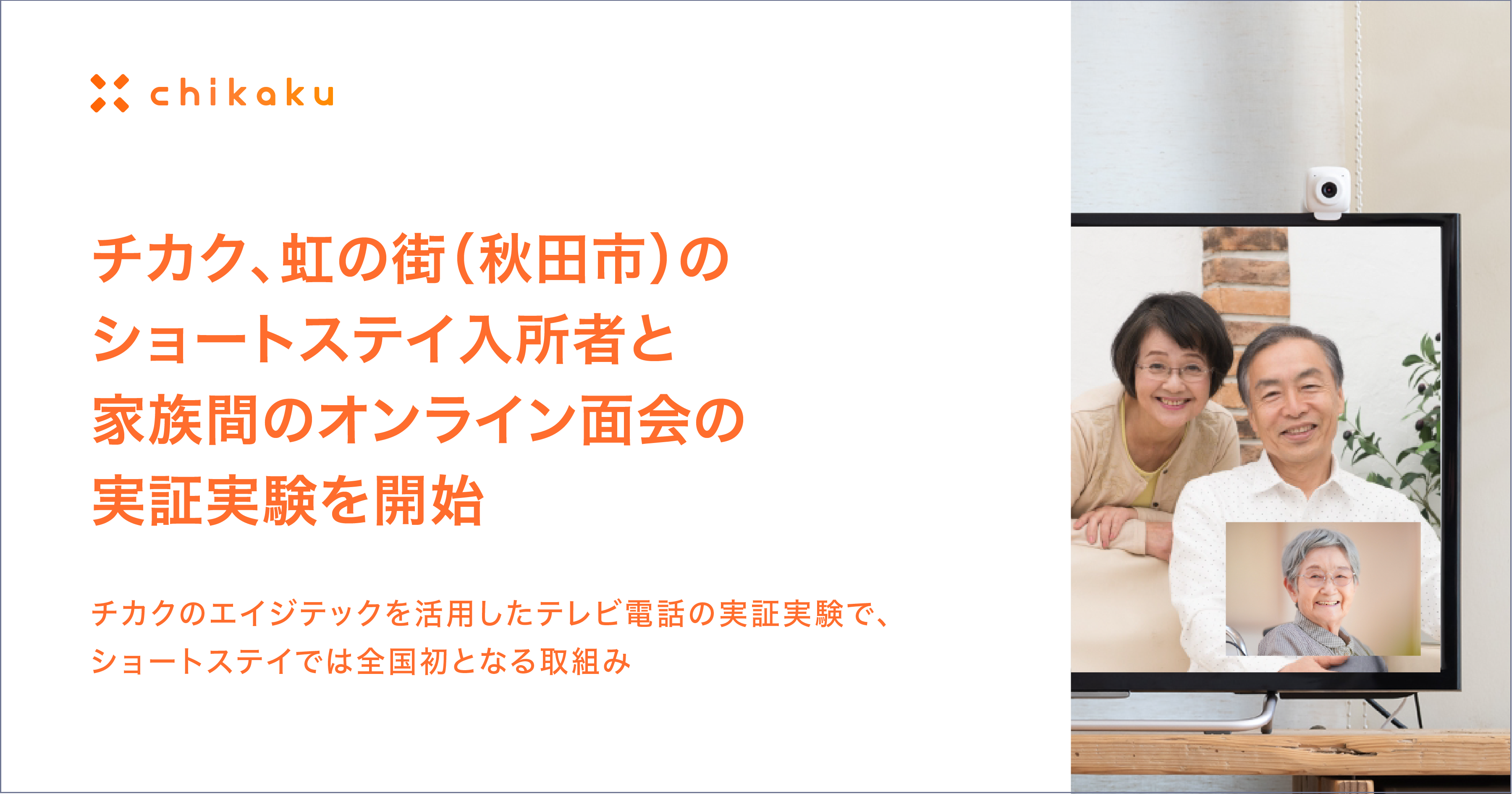 株式会社チカク(以下「チカク」)は、秋田県内で介護施設を運営する株式会社虹の街(秋田県秋田市、代表:原田賢弥、以下「虹の街」)の協力のもと、短期入所施設「やすらぎの郷 ショートステイ」において、チカクのテレビ電話を活用したオンライン面会の実証実験を5月11日より開始いたします。