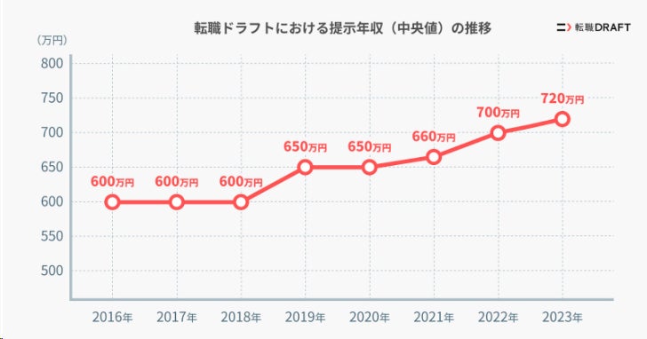 それに伴い、ITエンジニアの給与水準も上昇の一途をたどっており、転職ドラフトの指名時に提示される提示年収についても同様の傾向が見られます。